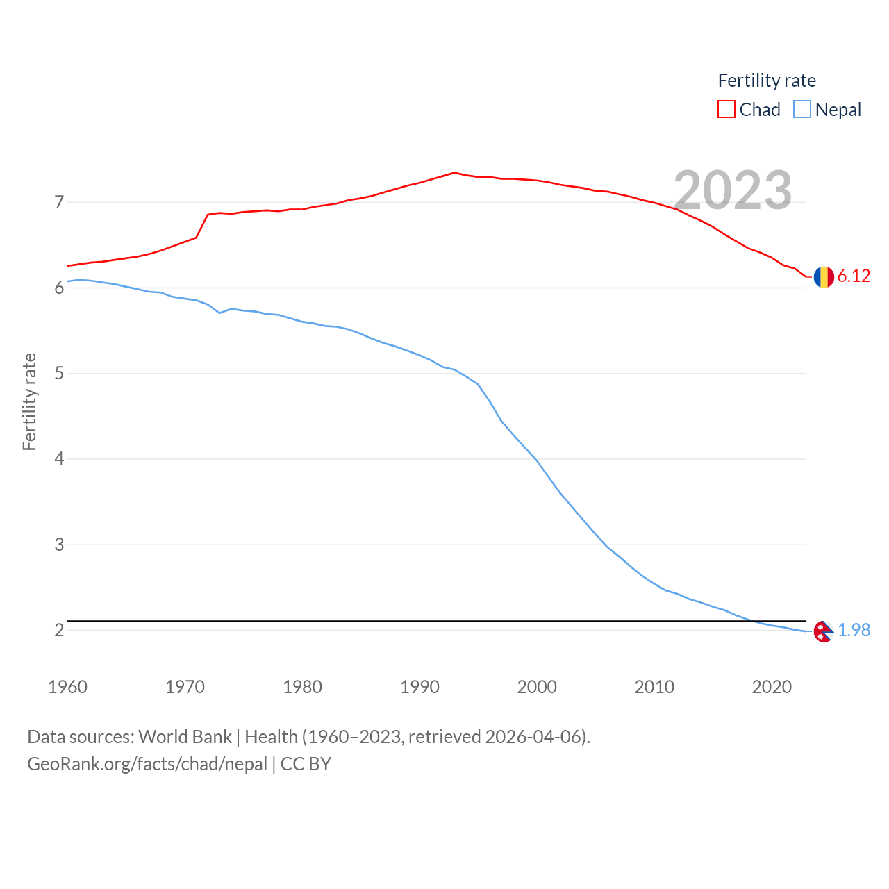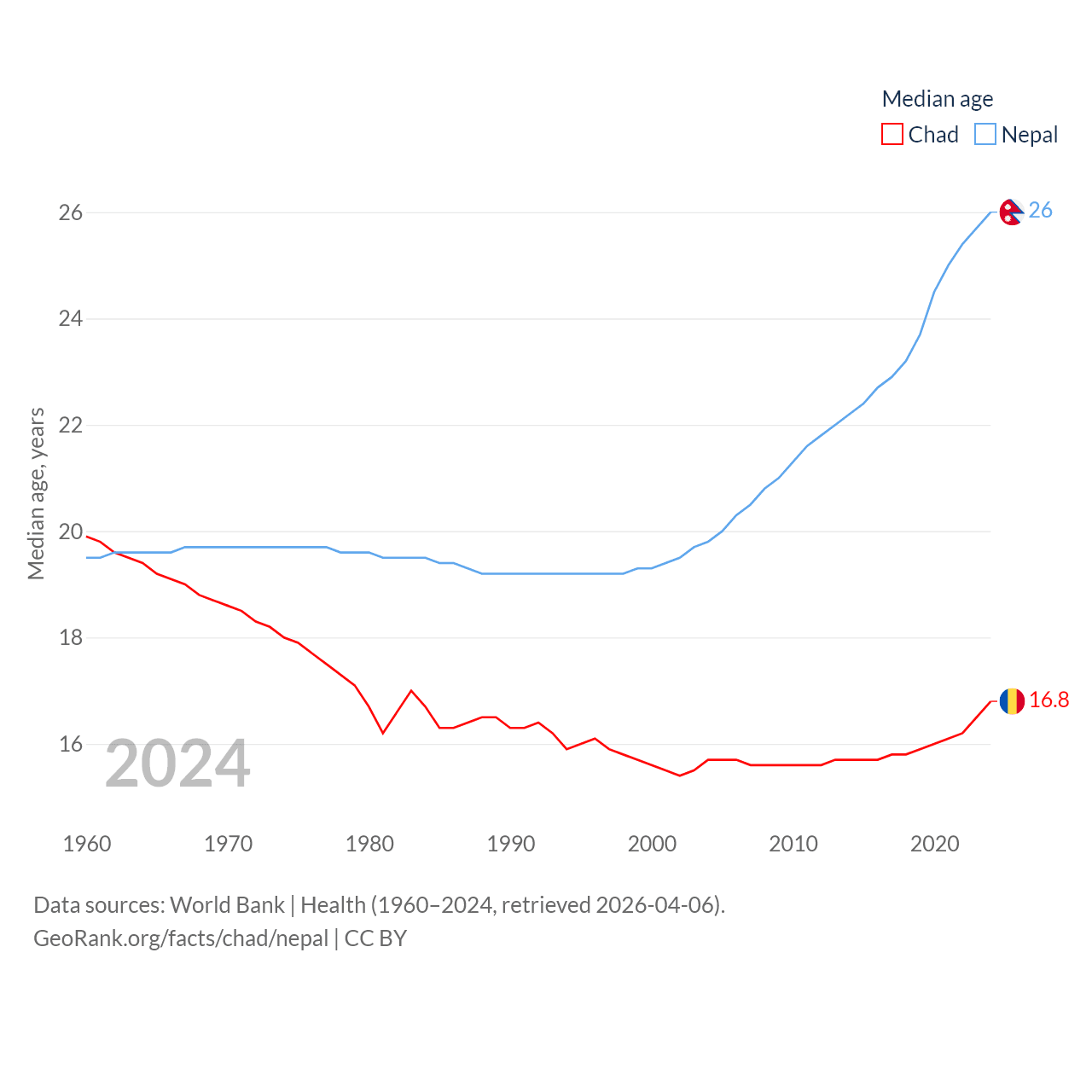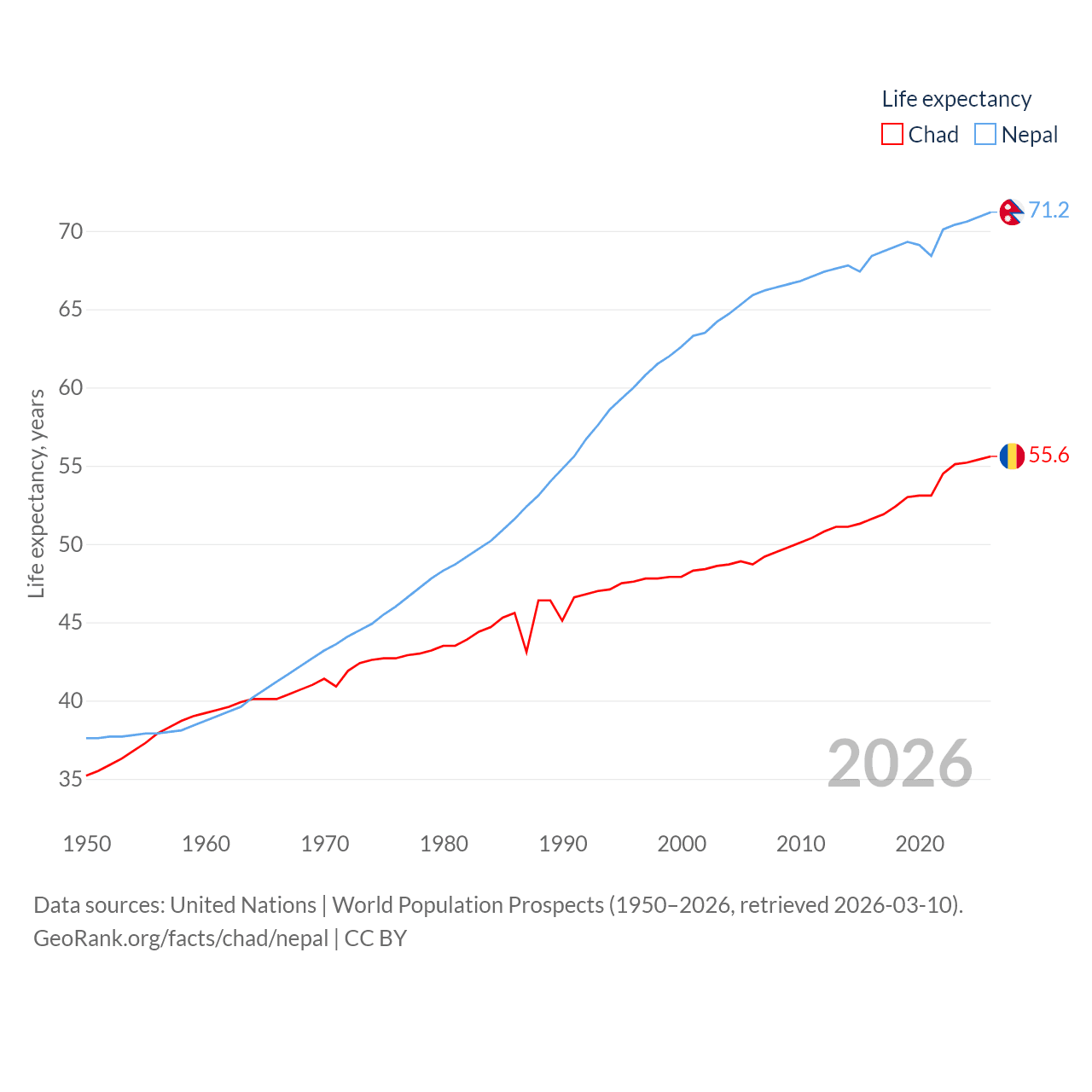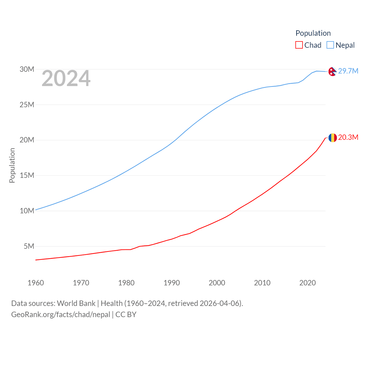 Chad has a population of 20.3M (ranked 65/197), compared with 29.7M in Nepal (ranked 51/197). Chad's land area is 486,180 sq mi versus 55,348 sq mi for Nepal (ranked 21st vs. 92nd).