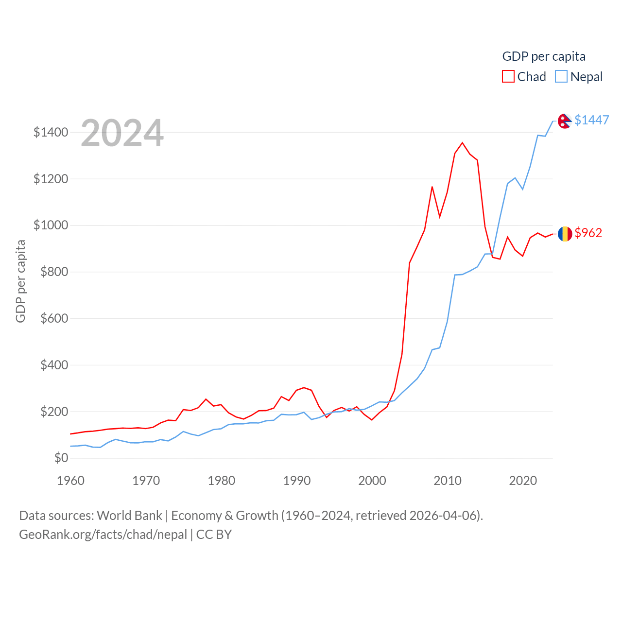 By GDP, Chad ranks 132/197 ($19.5B) and Nepal ranks 101/197 ($42.9B). By GDP per capita, Chad ranks 182/197 ($962), while Nepal ranks 164/197 ($1,447).