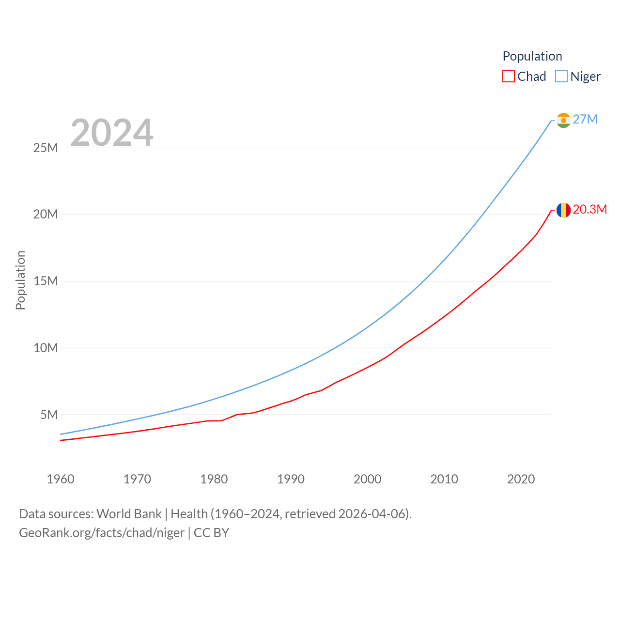 Chad has a population of 20.3M (ranked 65/197), compared with 27M in Niger (ranked 55/197). Chad's land area is 486,180 sq mi versus 489,076 sq mi for Niger (ranked 21st vs. 20th).