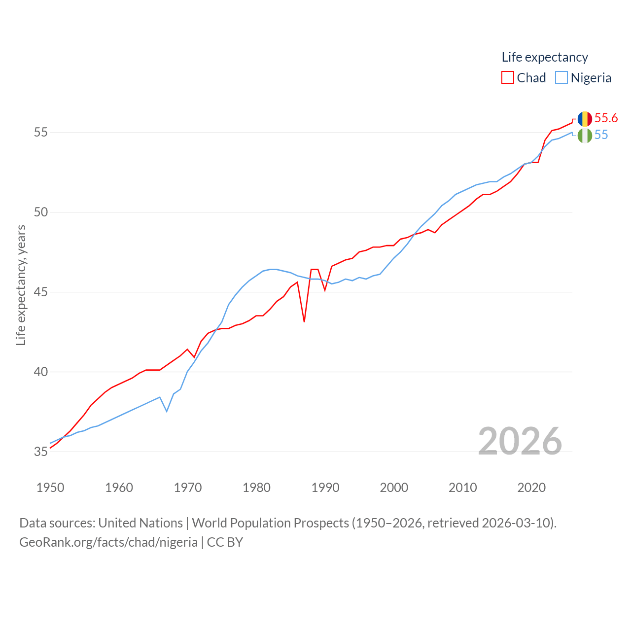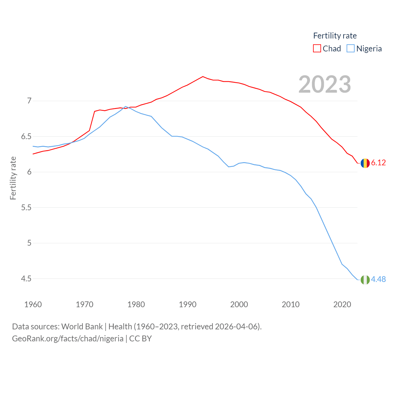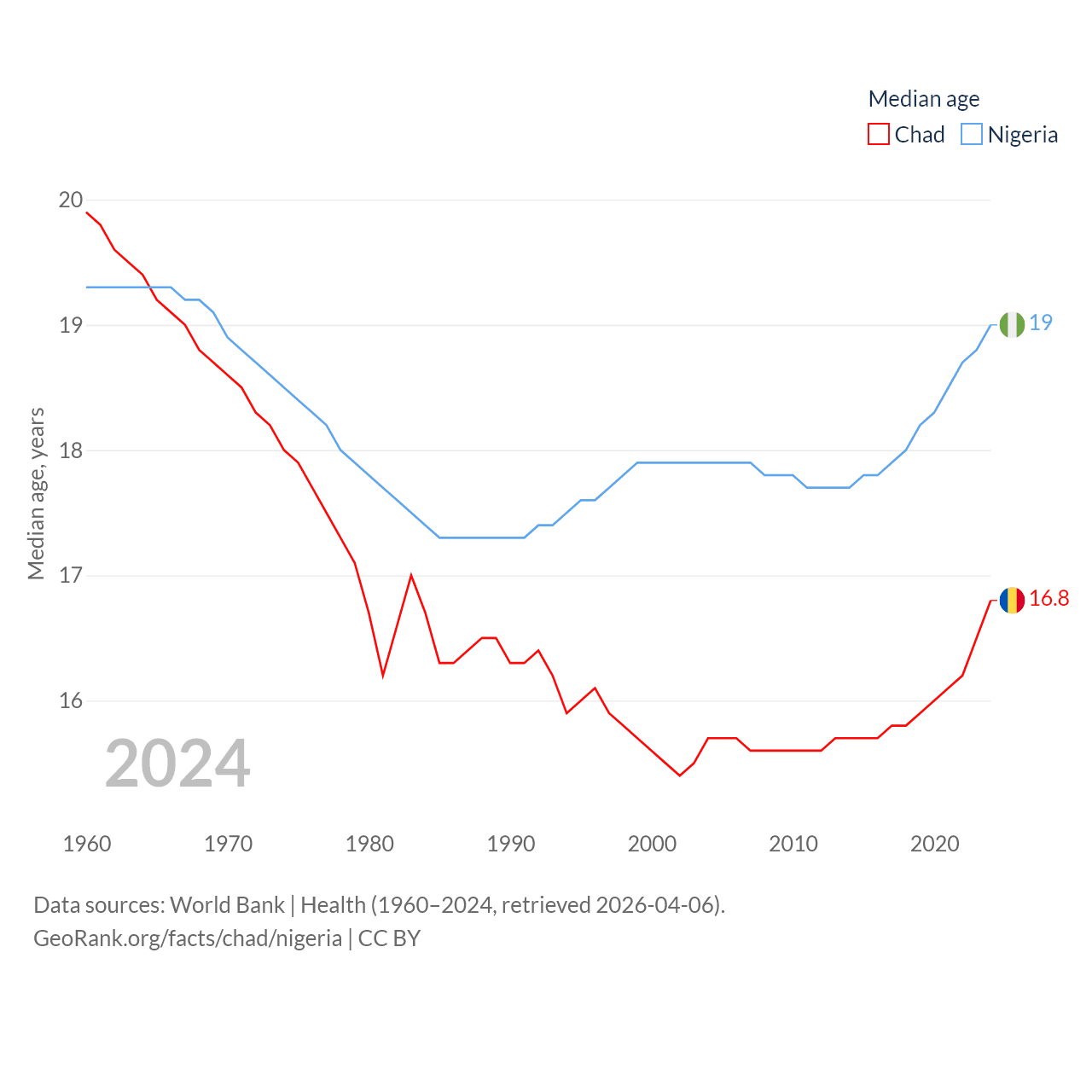 Chad has a population of 20.3M (ranked 65/197), compared with 233M in Nigeria (ranked 6/197). Chad's land area is 486,180 sq mi versus 351,650 sq mi for Nigeria (ranked 21st vs. 30th).