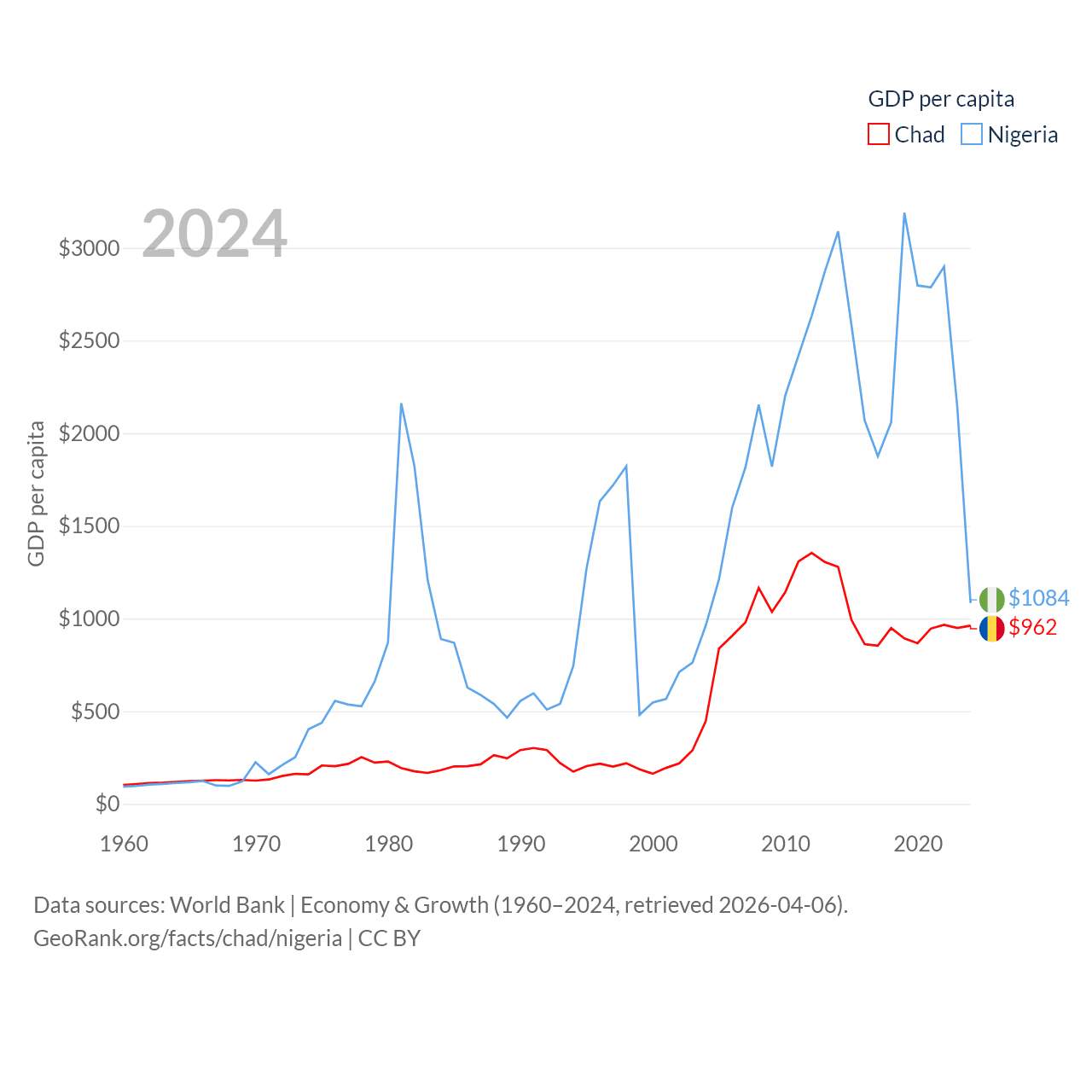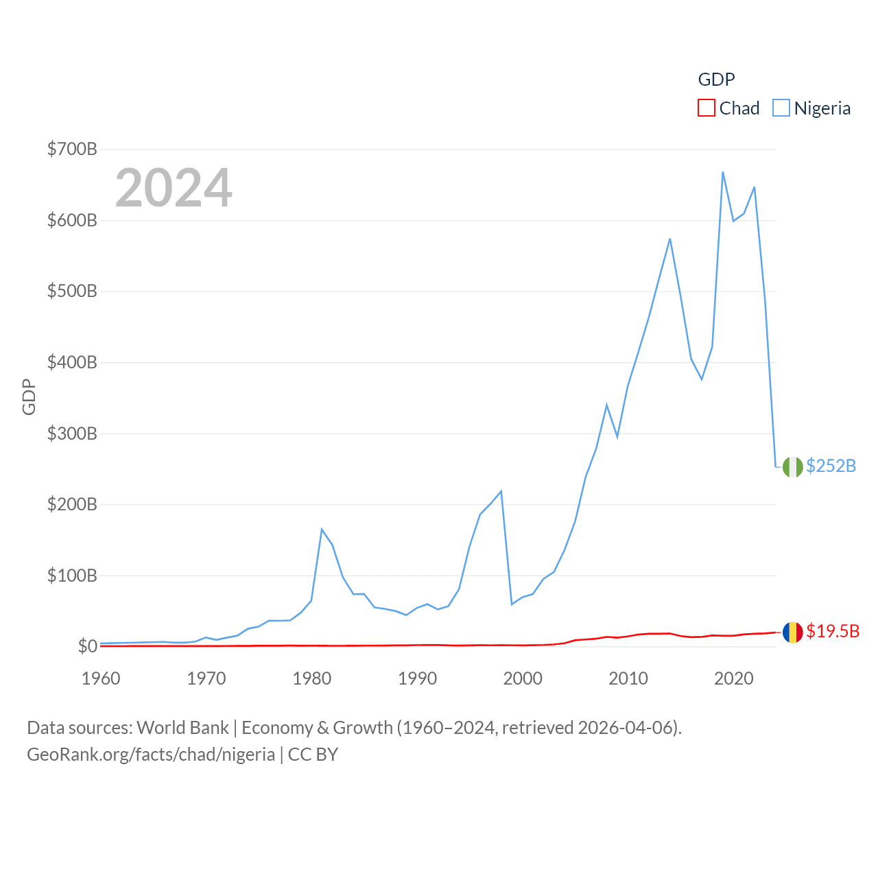 By GDP, Chad ranks 132/197 ($19.5B) and Nigeria ranks 54/197 ($252B). By GDP per capita, Chad ranks 182/197 ($962), while Nigeria ranks 174/197 ($1,084).