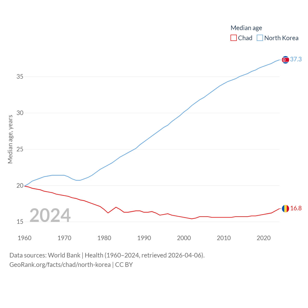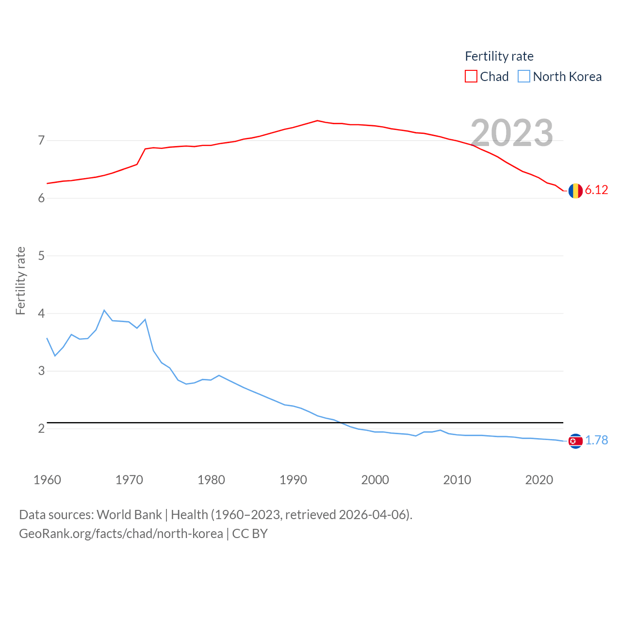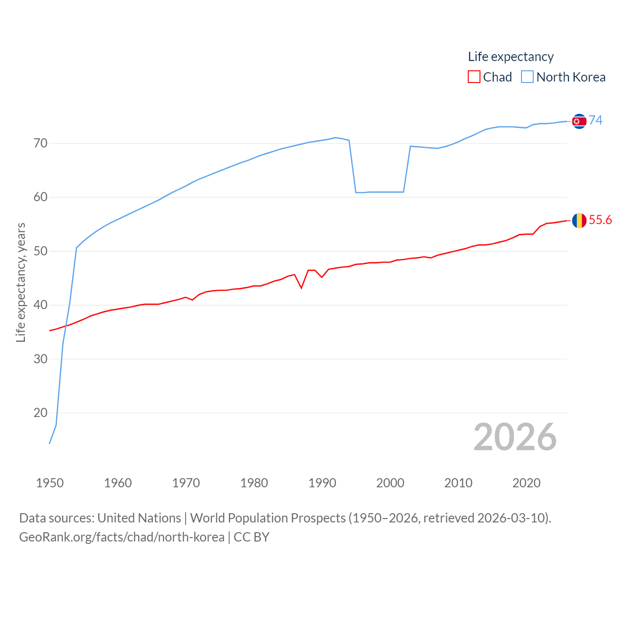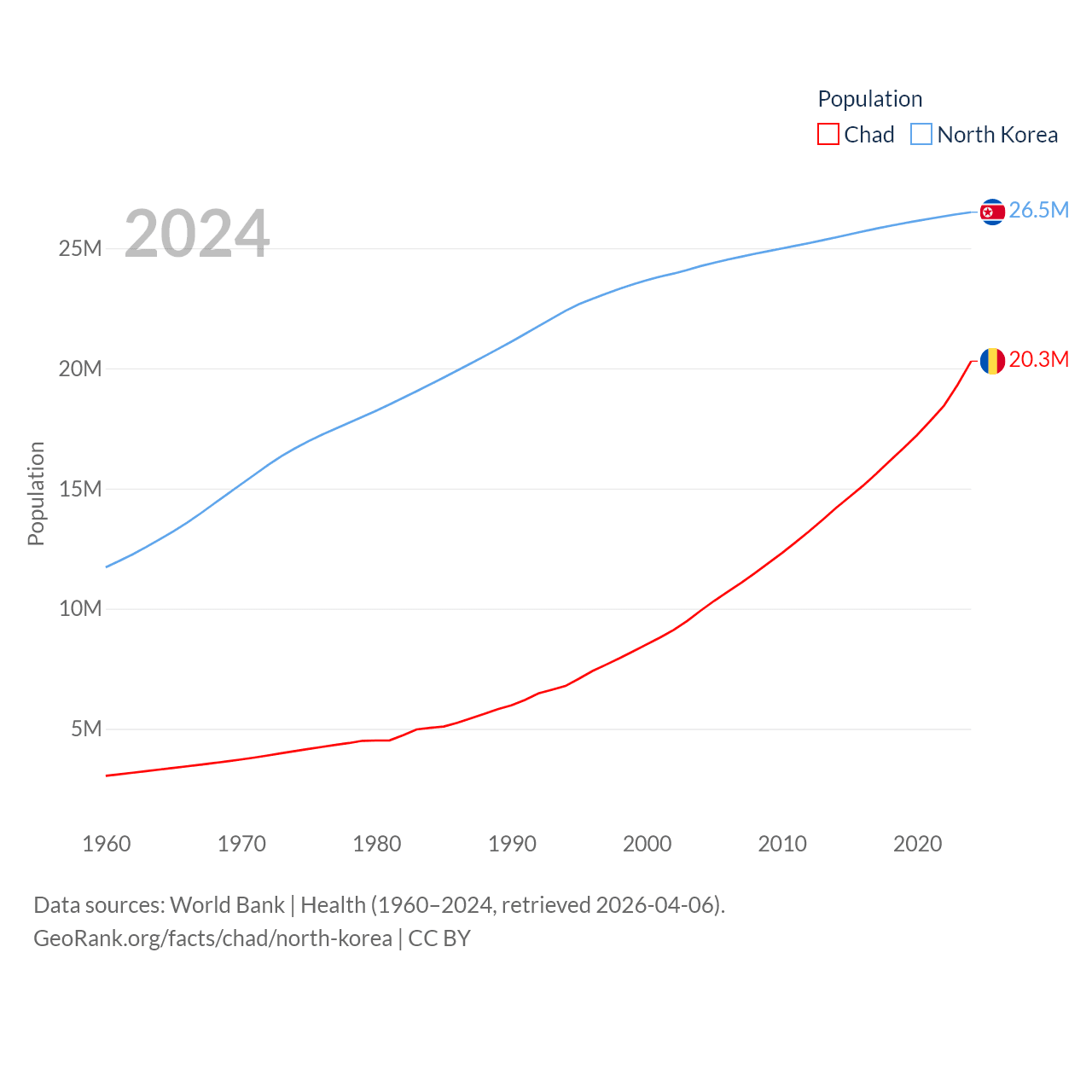 Chad has a population of 20.3M (ranked 65/197), compared with 26.5M in North Korea (ranked 56/197). Chad's land area is 486,180 sq mi versus 46,491 sq mi for North Korea (ranked 21st vs. 97th).