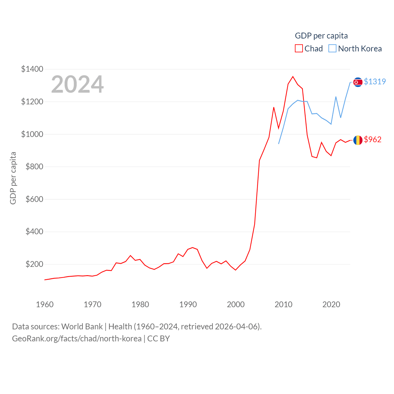 By GDP, Chad ranks 132/197 ($19.5B) and North Korea ranks 106/197 ($34.9B). By GDP per capita, Chad ranks 182/197 ($962), while North Korea ranks 168/197 ($1,319).