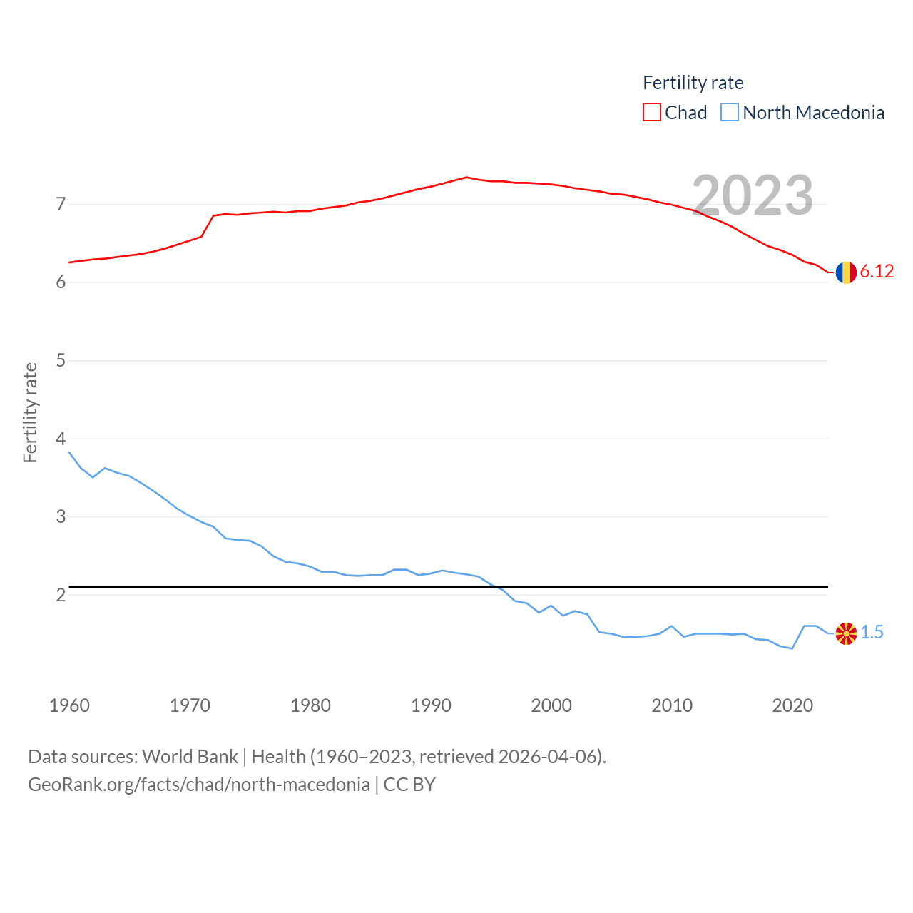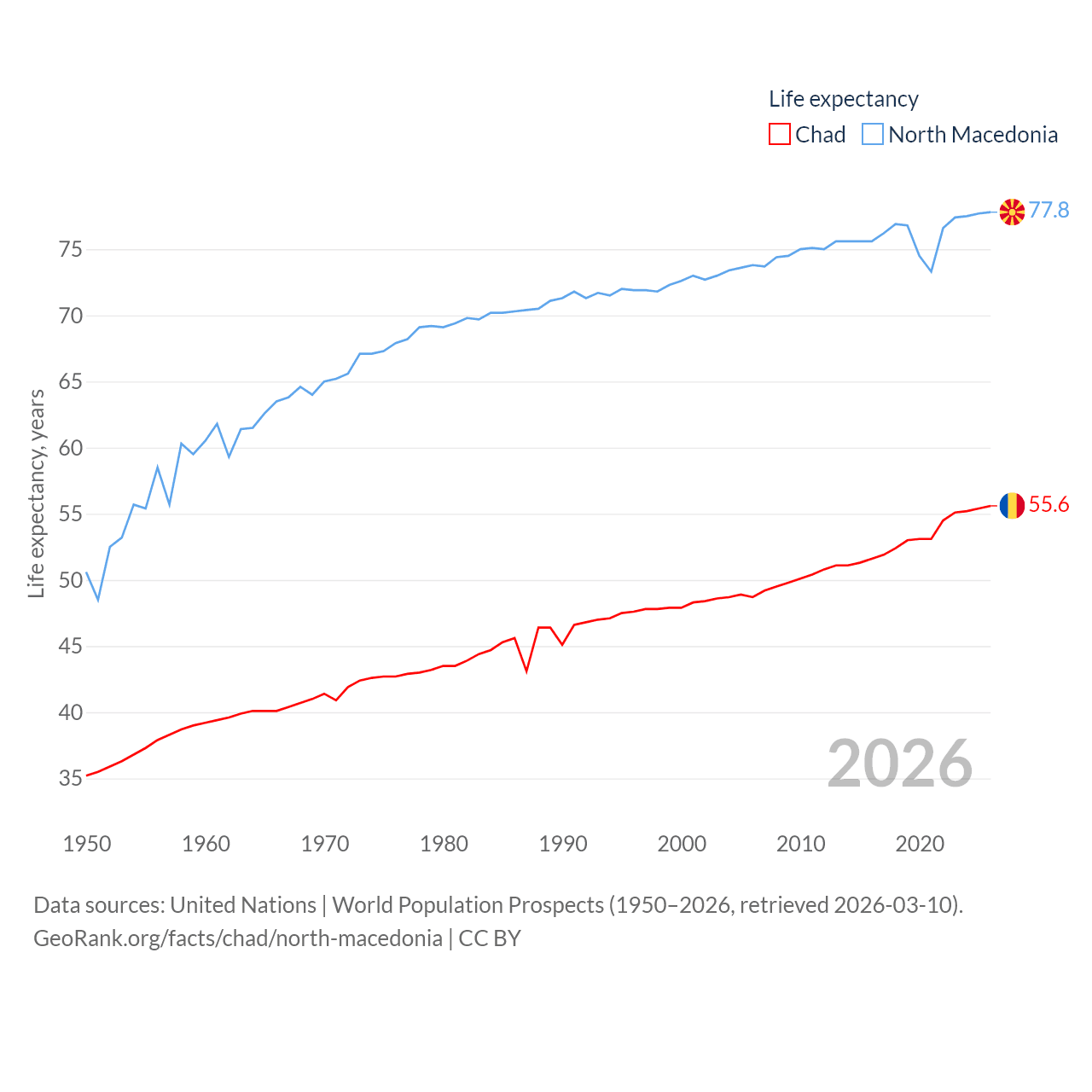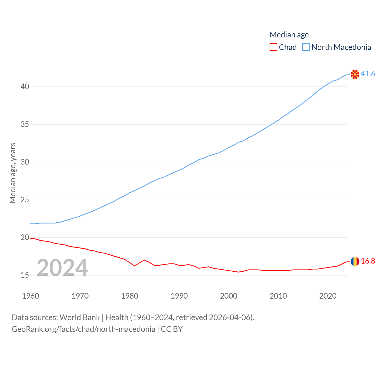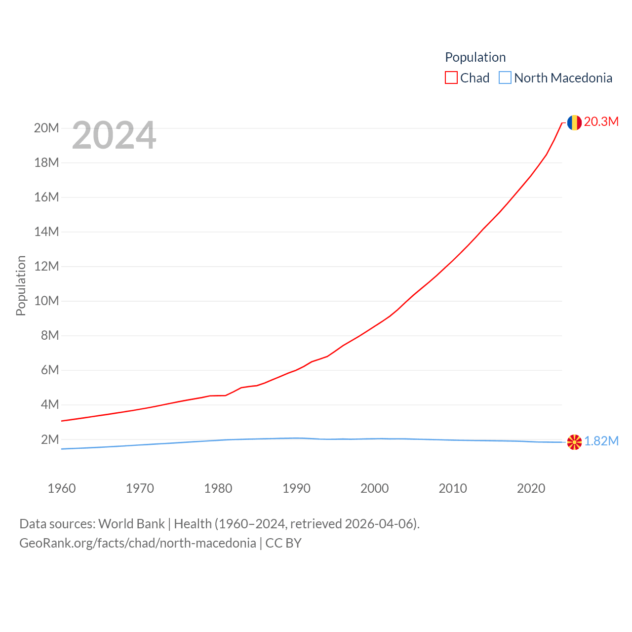 Chad has a population of 20.3M (ranked 65/197), compared with 1.82M in North Macedonia (ranked 150/197). Chad's land area is 486,180 sq mi versus 9,737 sq mi for North Macedonia (ranked 21st vs. 145th).