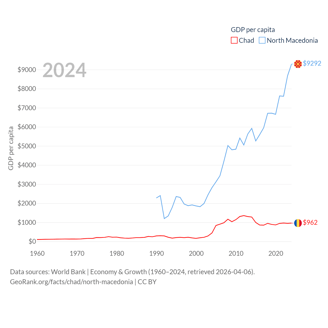By GDP, Chad ranks 132/197 ($19.5B) and North Macedonia ranks 138/197 ($17B). By GDP per capita, Chad ranks 182/197 ($962), while North Macedonia ranks 88/197 ($9,292).