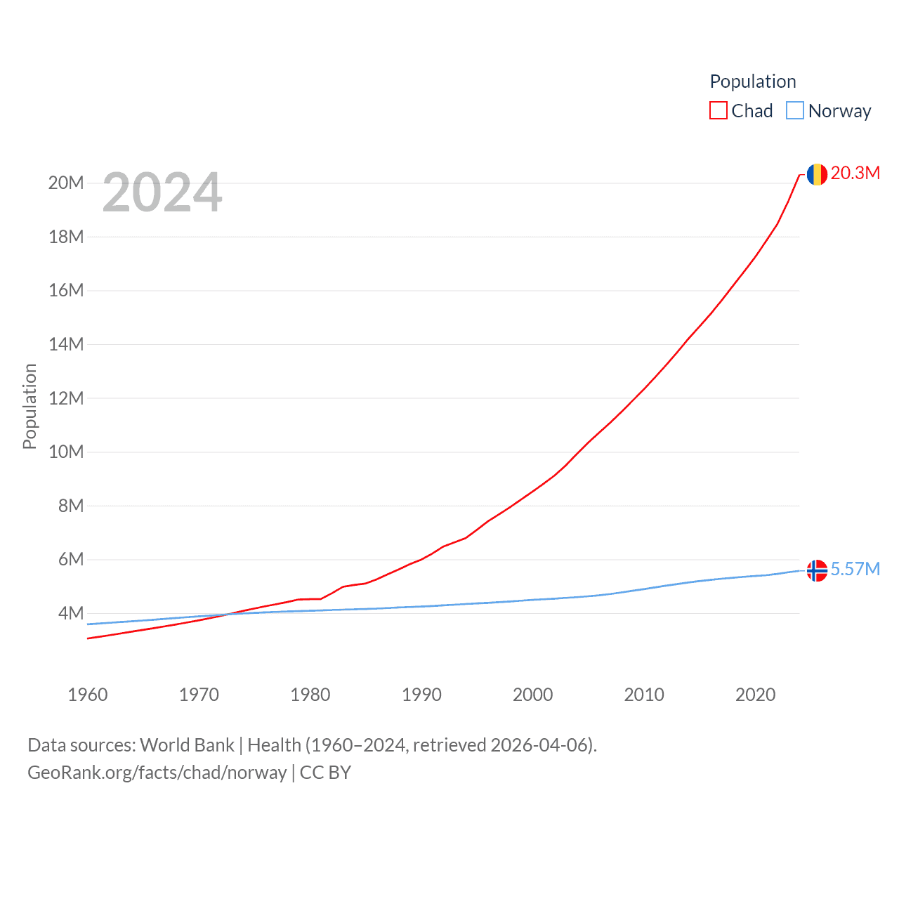 Chad has a population of 20.3M (ranked 65/197), compared with 5.57M in Norway (ranked 118/197). Chad's land area is 486,180 sq mi versus 140,645 sq mi for Norway (ranked 21st vs. 62nd).