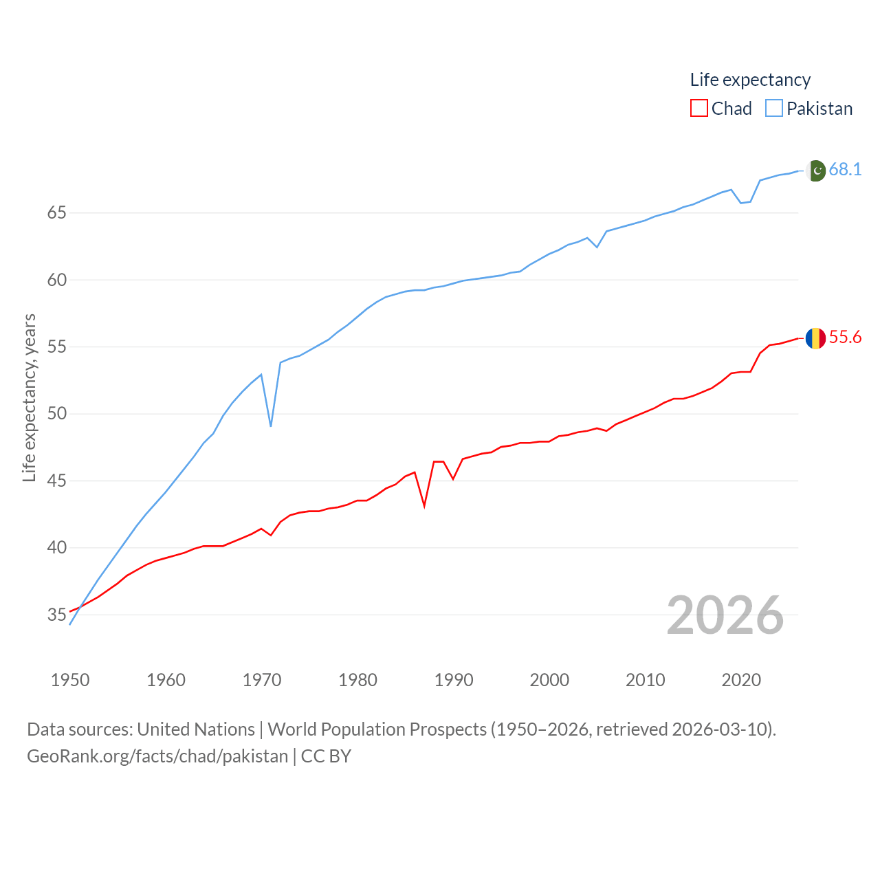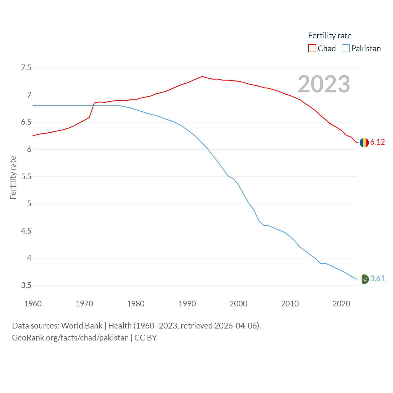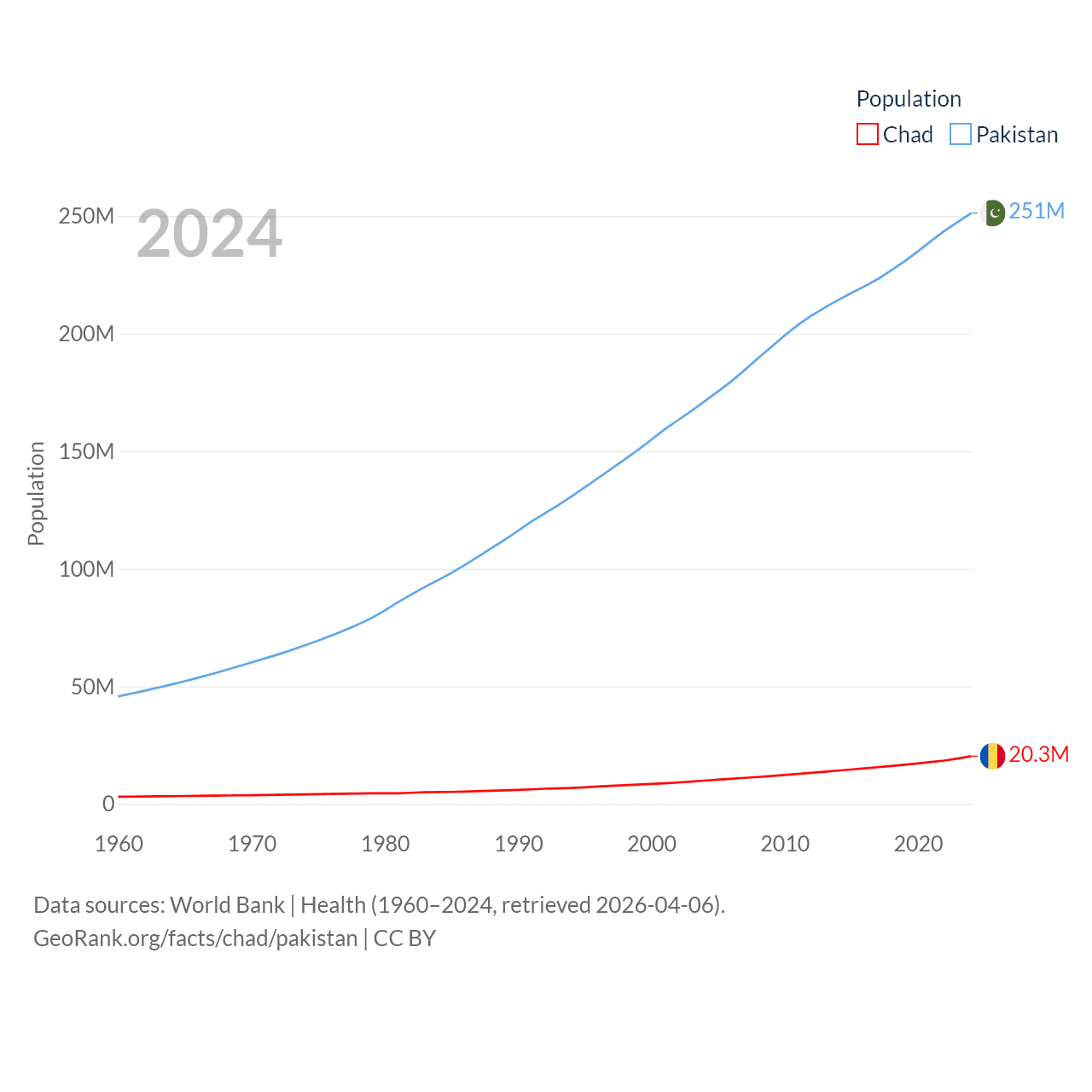 Chad has a population of 20.3M (ranked 65/197), compared with 251M in Pakistan (ranked 5/197). Chad's land area is 486,180 sq mi versus 297,638 sq mi for Pakistan (ranked 21st vs. 35th).