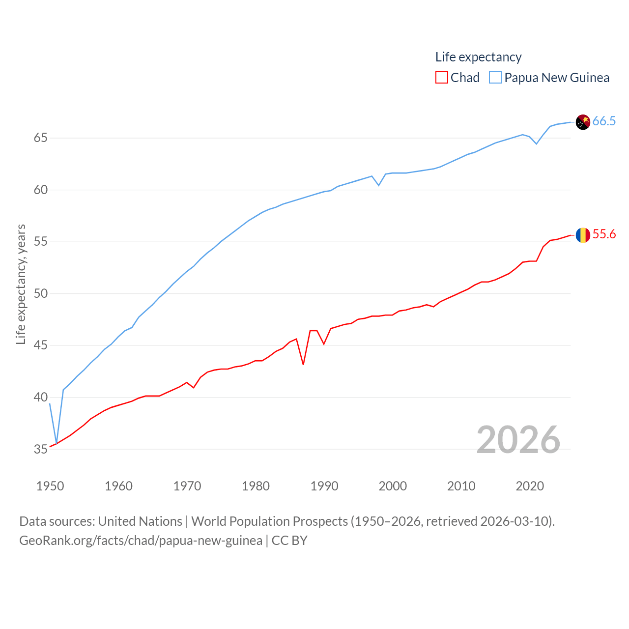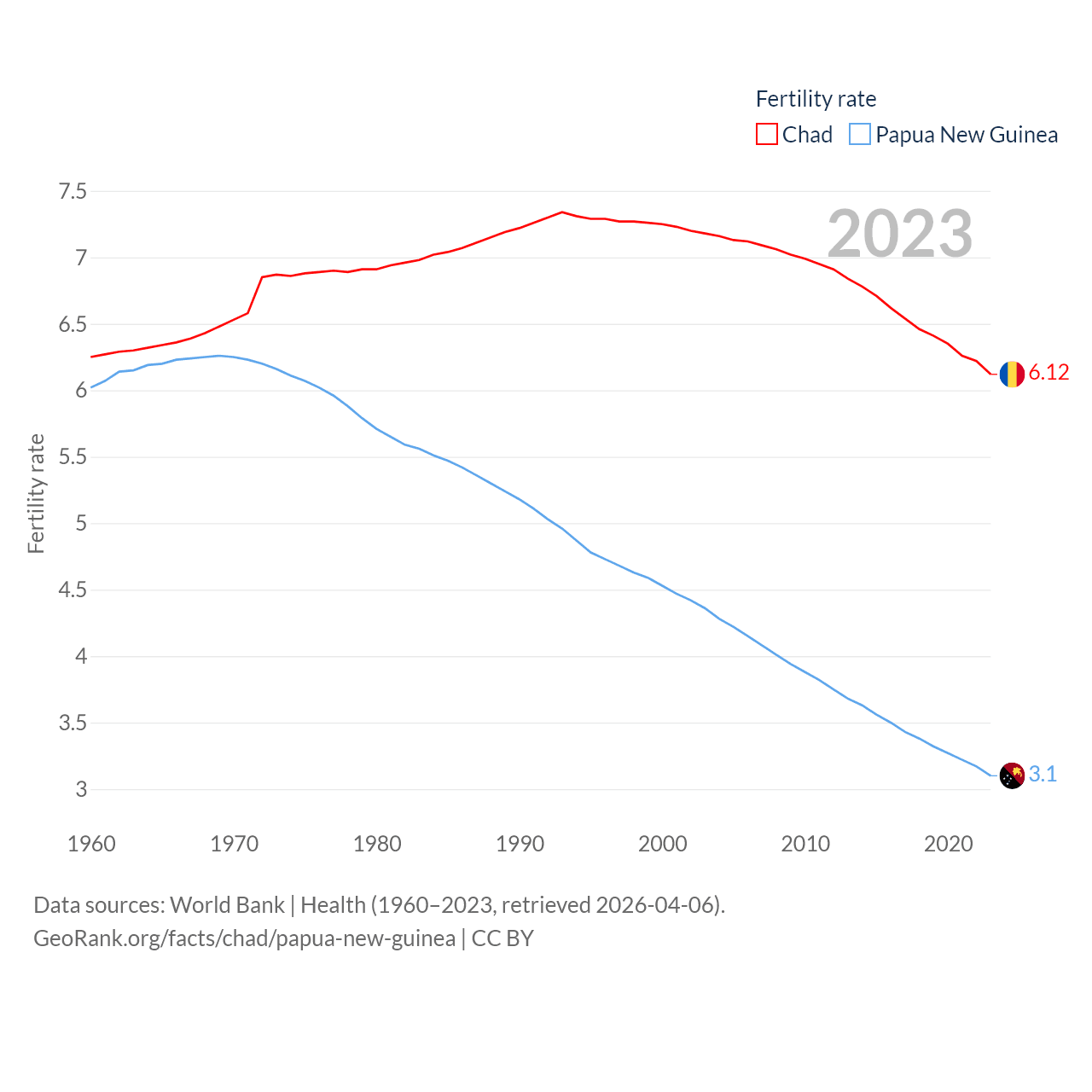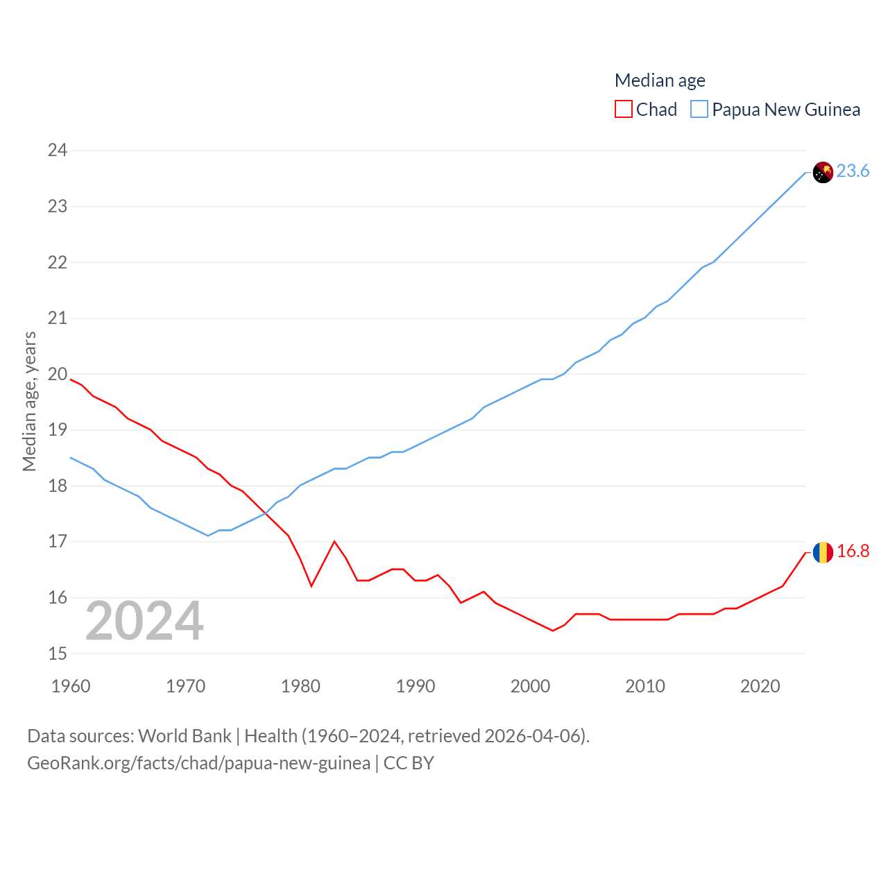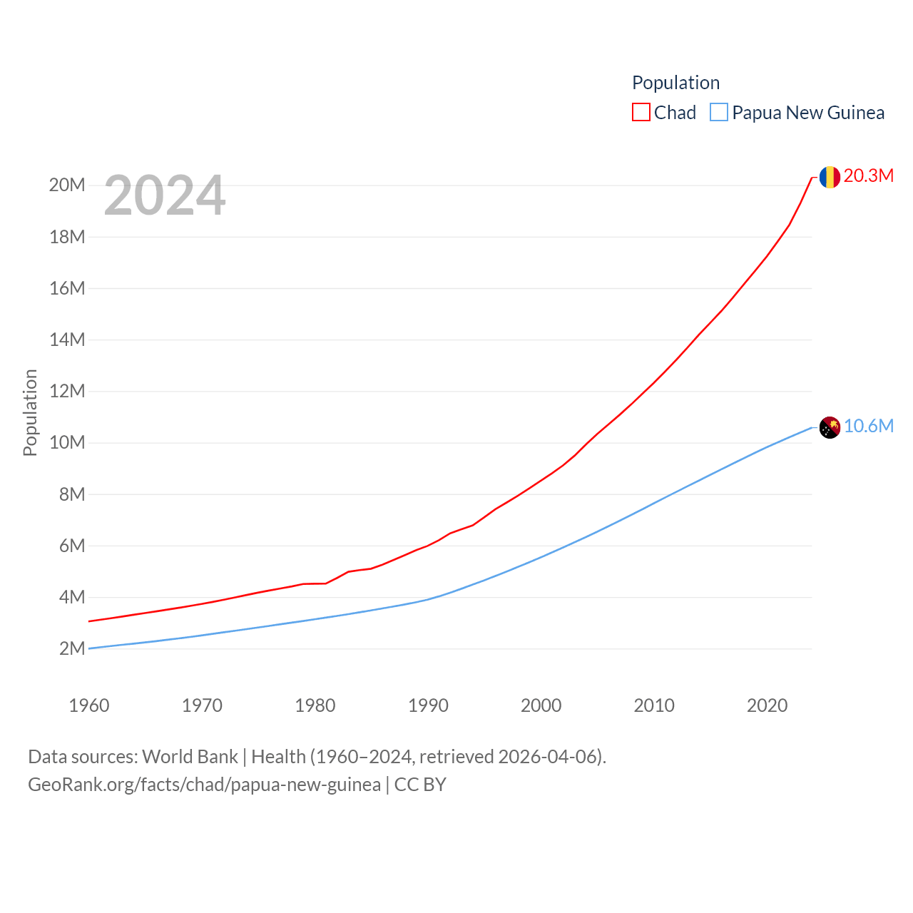 Chad has a population of 20.3M (ranked 65/197), compared with 10.6M in Papua New Guinea (ranked 92/197). Chad's land area is 486,180 sq mi versus 174,850 sq mi for Papua New Guinea (ranked 21st vs. 54th).