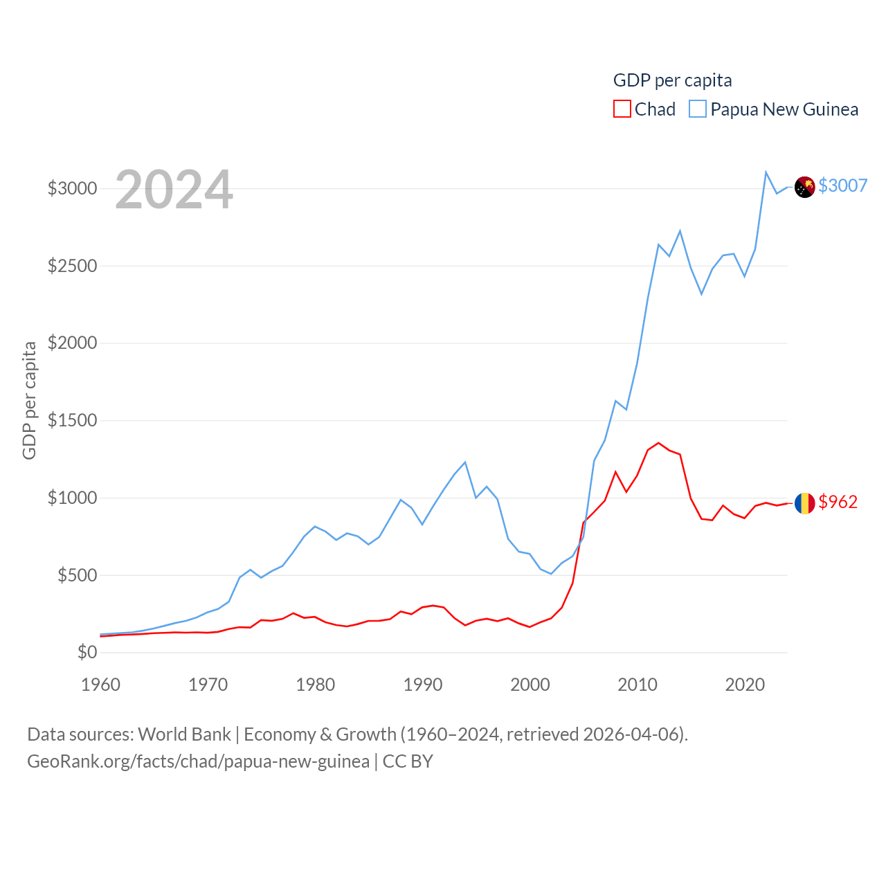 By GDP, Chad ranks 132/197 ($19.5B) and Papua New Guinea ranks 110/197 ($31.8B). By GDP per capita, Chad ranks 182/197 ($962), while Papua New Guinea ranks 140/197 ($3,007).