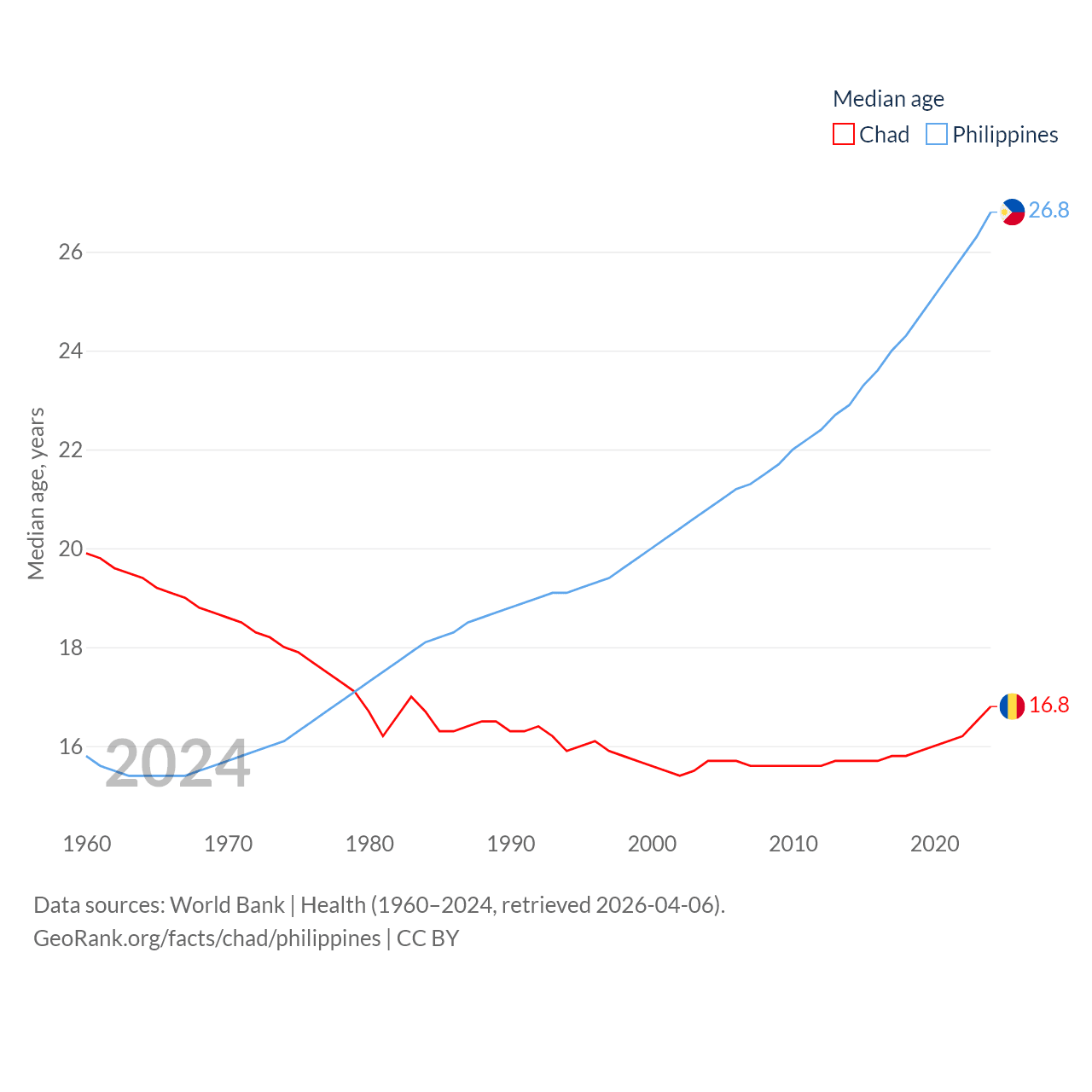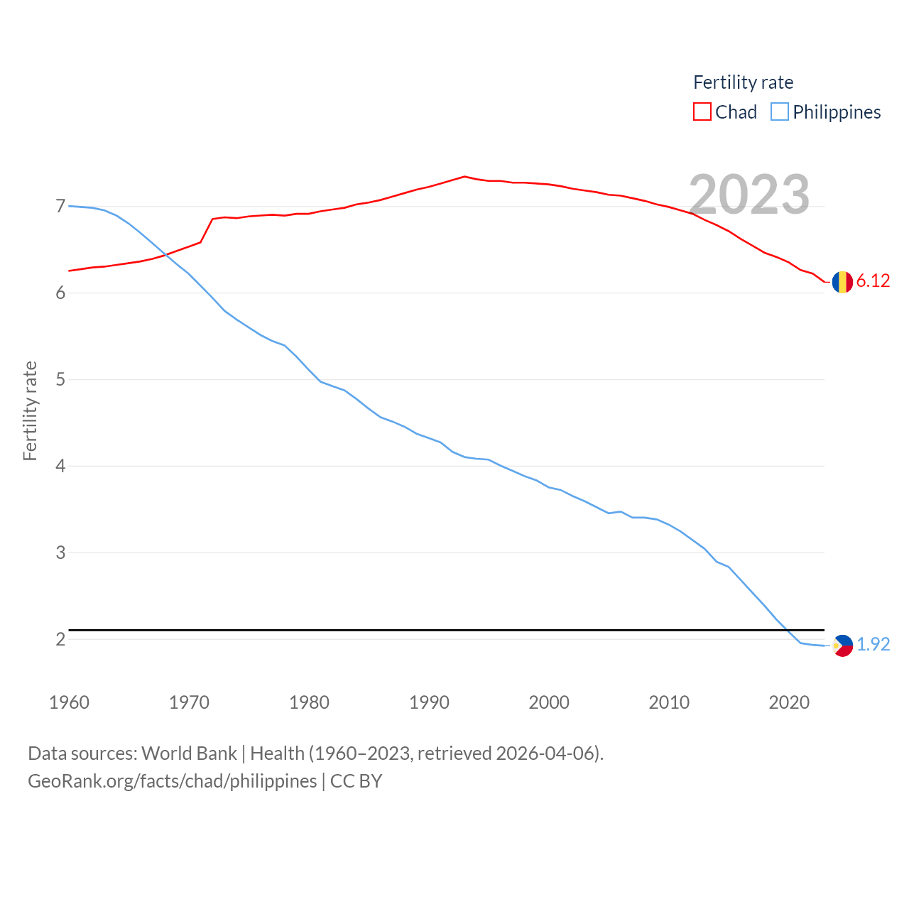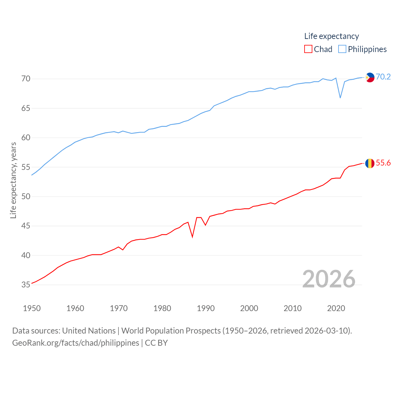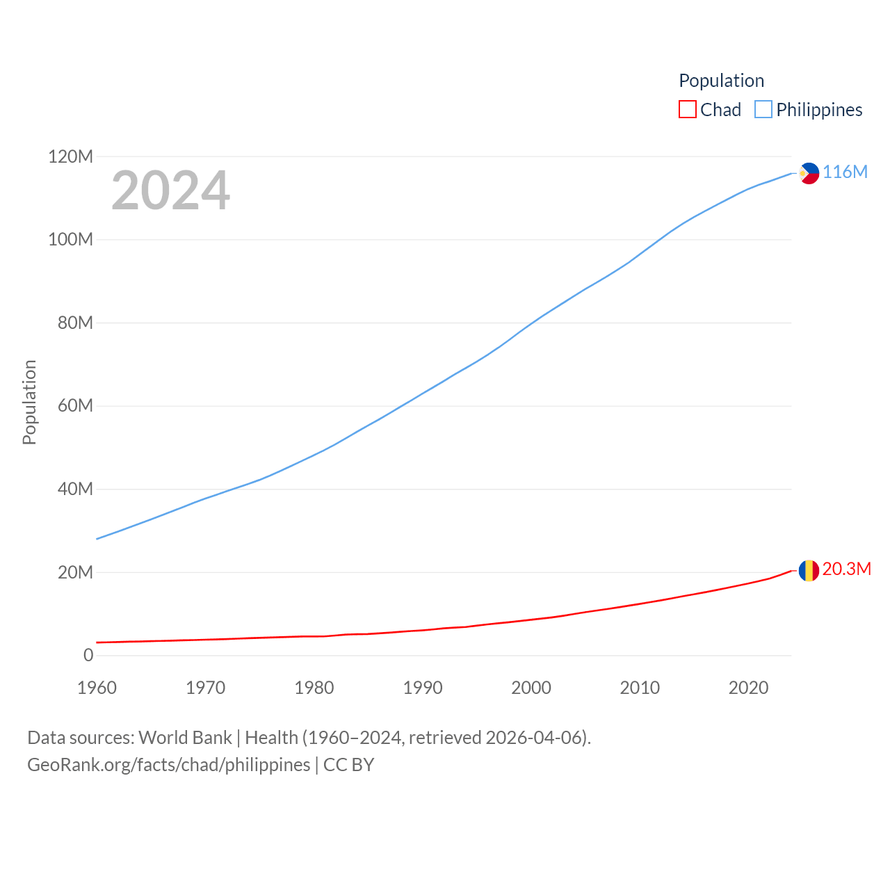 Chad has a population of 20.3M (ranked 65/197), compared with 116M in The Philippines (ranked 14/197). Chad's land area is 486,180 sq mi versus 115,124 sq mi for The Philippines (ranked 21st vs. 71st).
