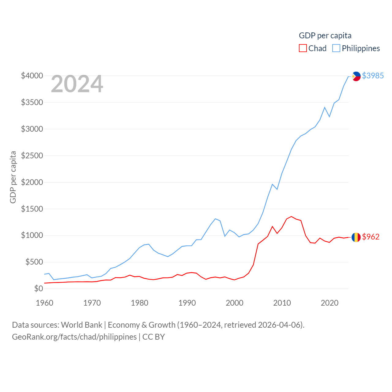 By GDP, Chad ranks 132/197 ($19.5B) and The Philippines ranks 35/197 ($462B). By GDP per capita, Chad ranks 182/197 ($962), while The Philippines ranks 130/197 ($3,985).