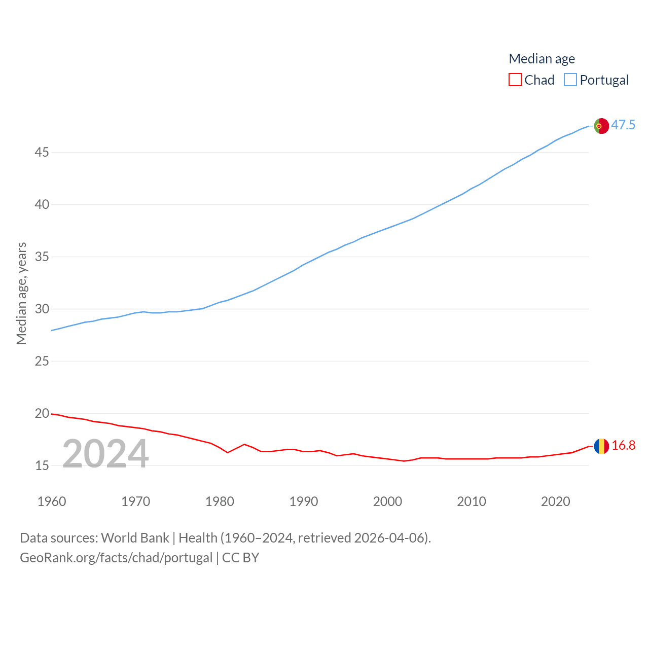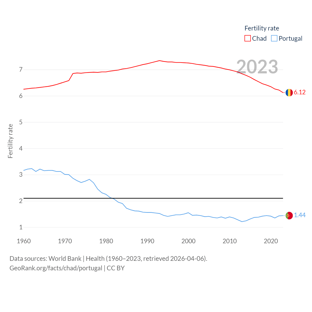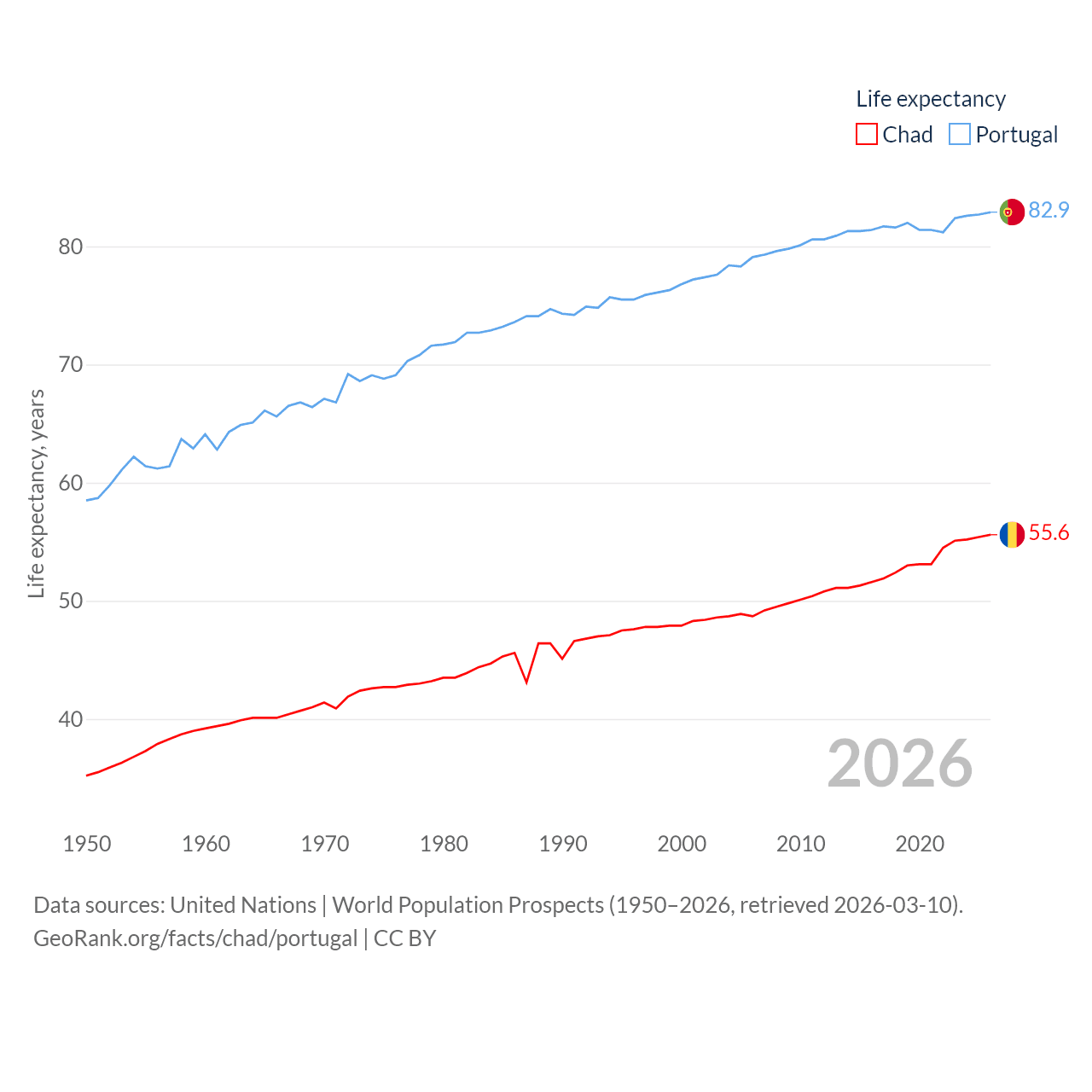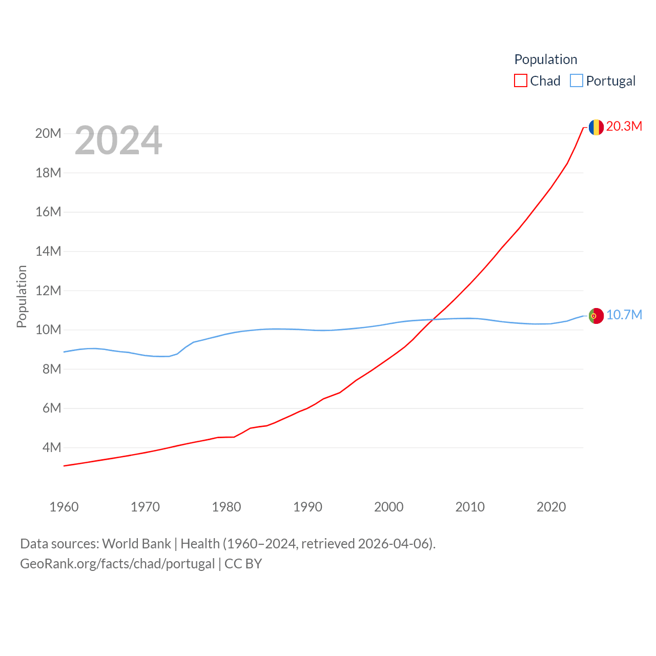 Chad has a population of 20.3M (ranked 65/197), compared with 10.7M in Portugal (ranked 90/197). Chad's land area is 486,180 sq mi versus 35,369 sq mi for Portugal (ranked 21st vs. 108th).