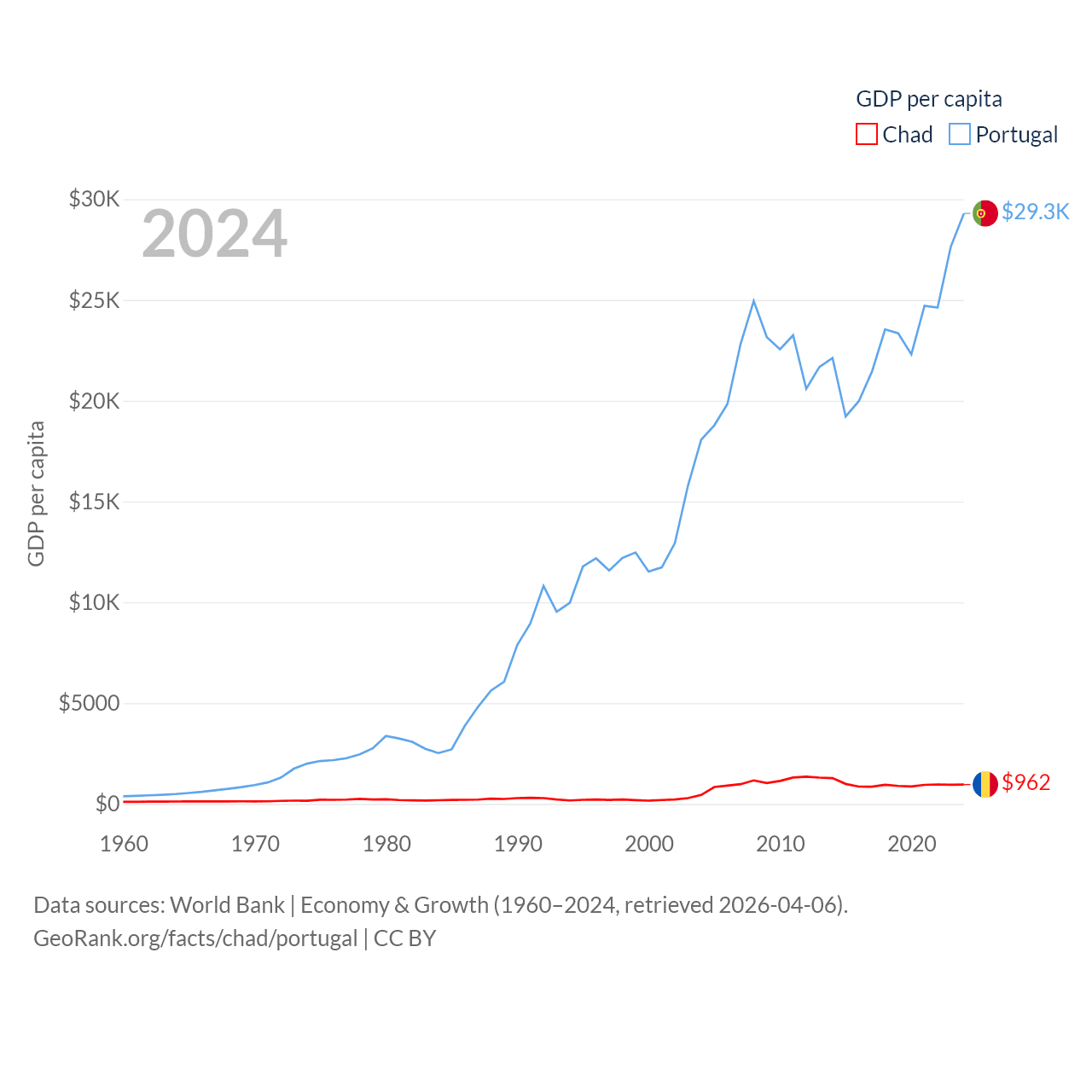 By GDP, Chad ranks 132/197 ($19.5B) and Portugal ranks 46/197 ($313B). By GDP per capita, Chad ranks 182/197 ($962), while Portugal ranks 44/197 ($29,292).