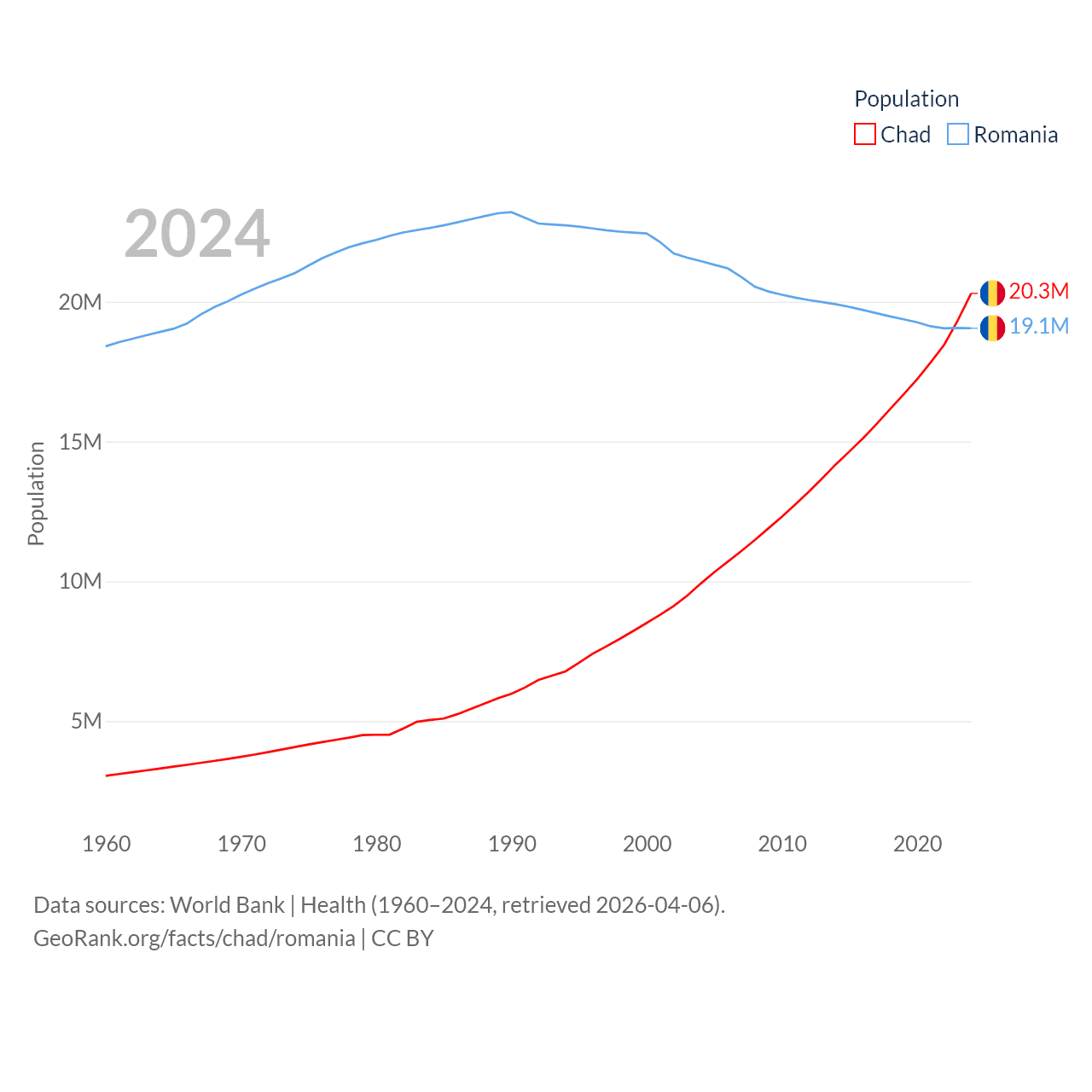 Chad has a population of 20.3M (ranked 65/197), compared with 19.1M in Romania (ranked 67/197). Chad's land area is 486,180 sq mi versus 88,834 sq mi for Romania (ranked 21st vs. 80th).