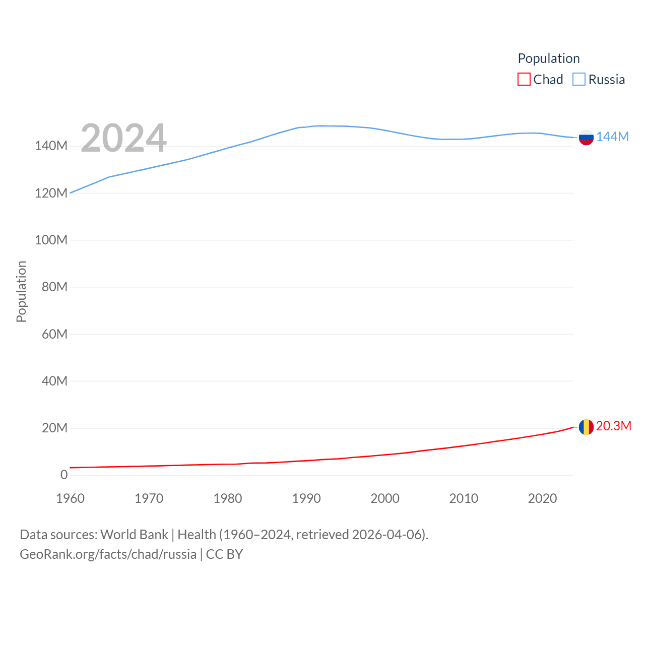 Chad has a population of 20.3M (ranked 65/197), compared with 144M in Russia (ranked 9/197). Chad's land area is 486,180 sq mi versus 6,323,145 sq mi for Russia (ranked 21st vs. 1st).