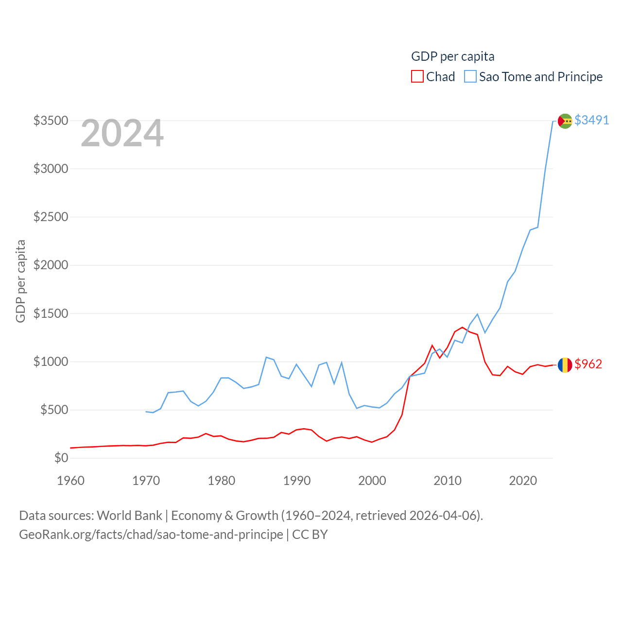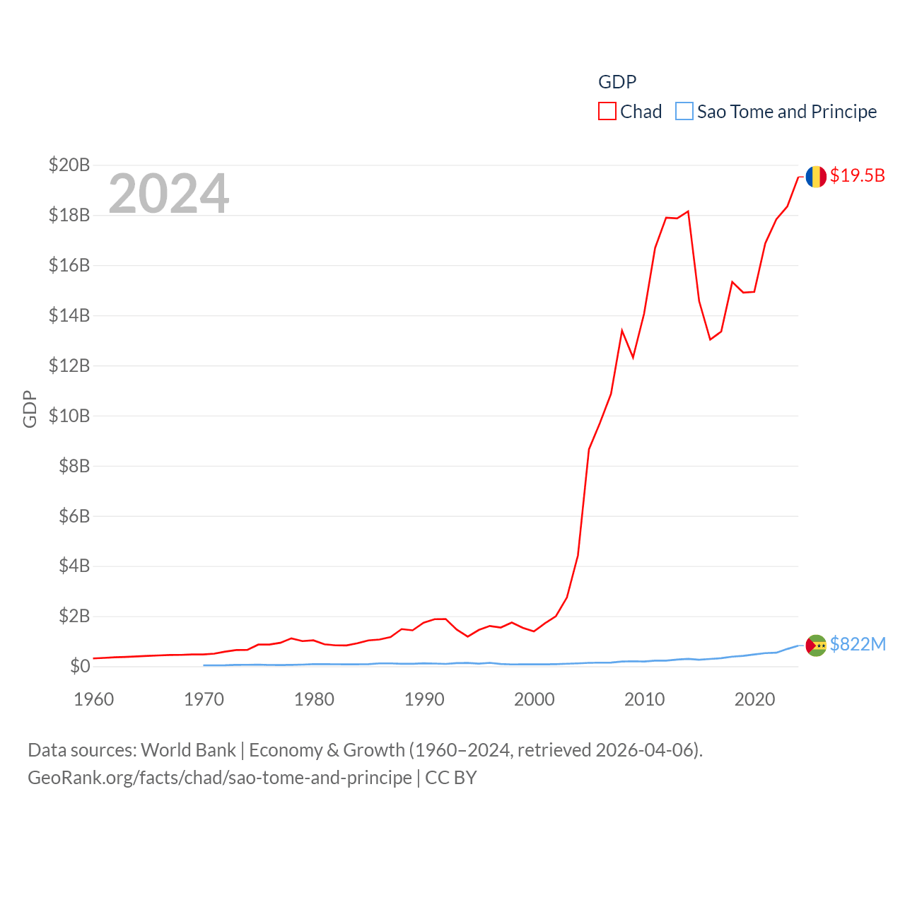 By GDP, Chad ranks 132/197 ($19.5B) and Sao Tome and Principe ranks 189/197 ($822M). By GDP per capita, Chad ranks 182/197 ($962), while Sao Tome and Principe ranks 134/197 ($3,491).
