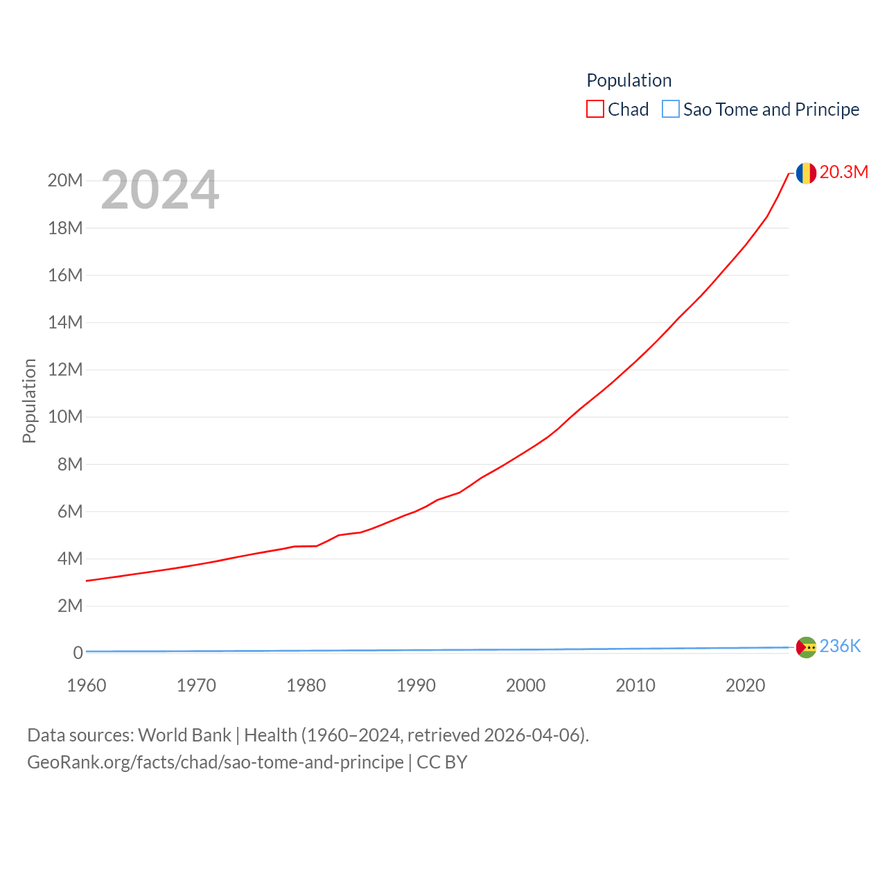 Chad has a population of 20.3M (ranked 65/197), compared with 236K in Sao Tome and Principe (ranked 176/197). Chad's land area is 486,180 sq mi versus 371 sq mi for Sao Tome and Principe (ranked 21st vs. 172nd).