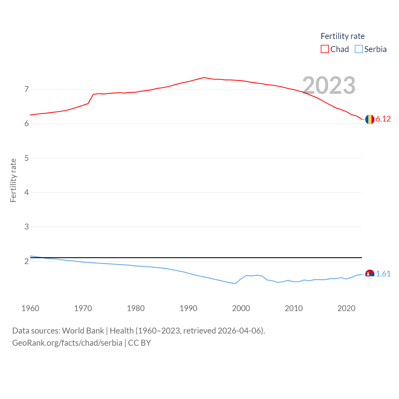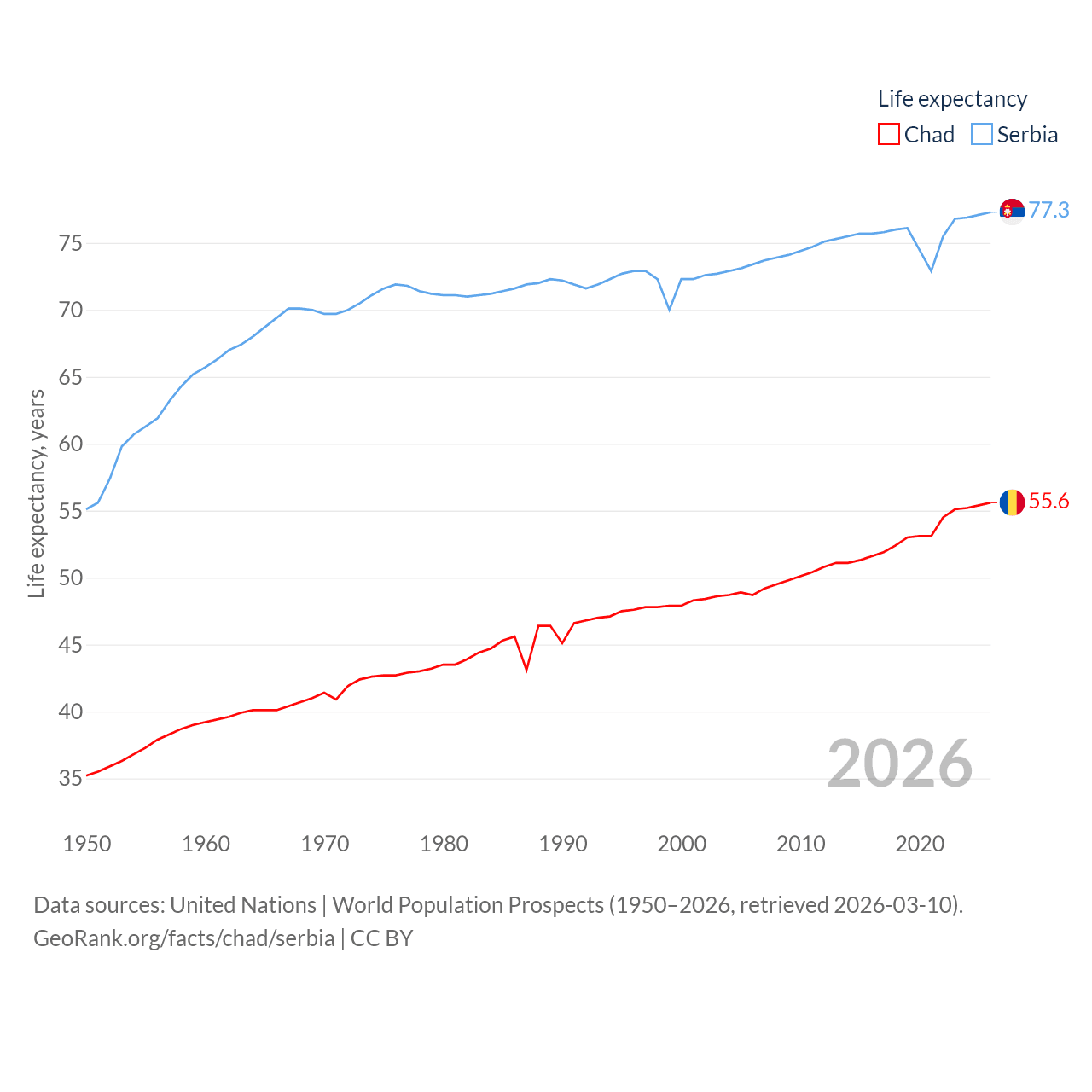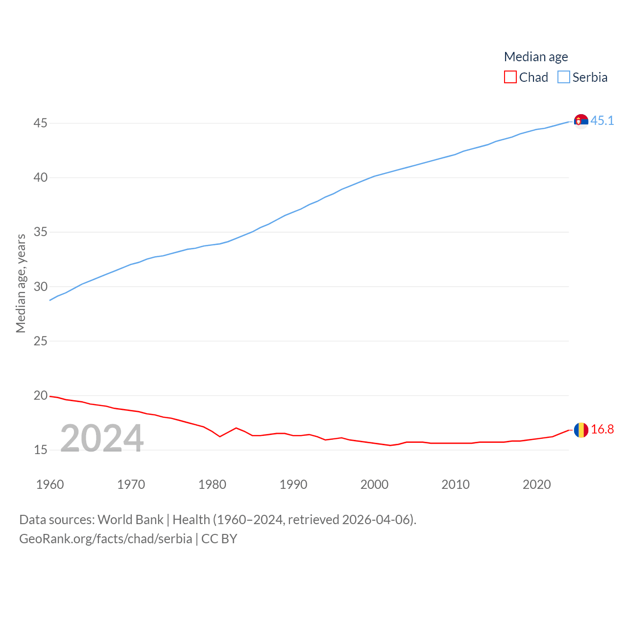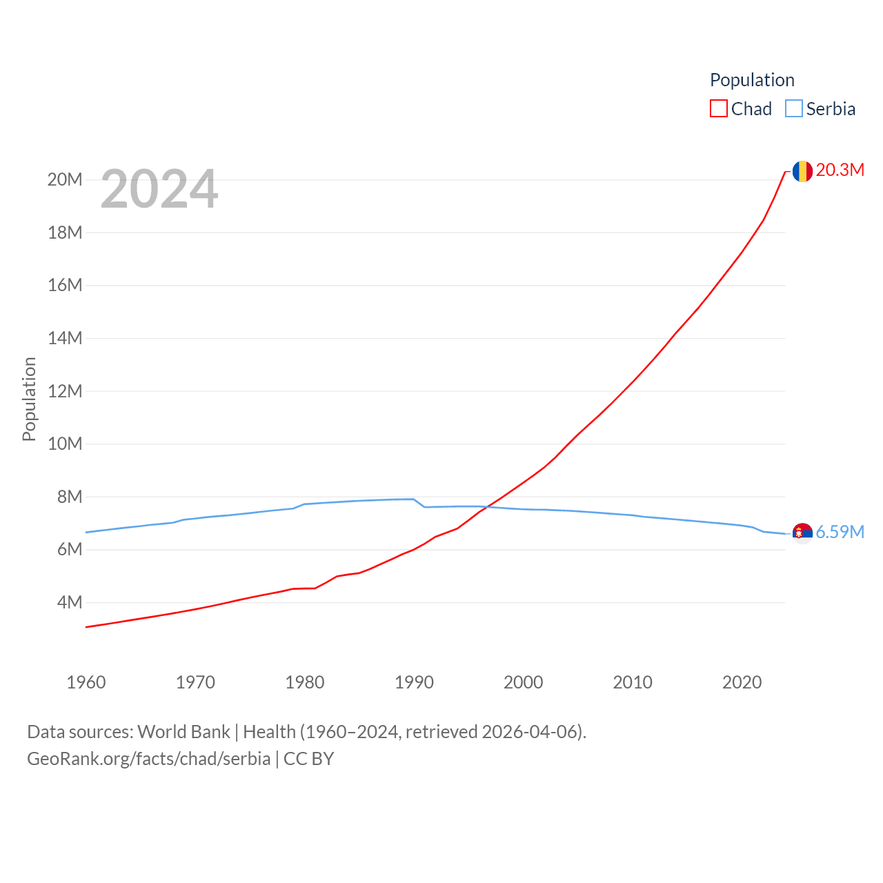 Chad has a population of 20.3M (ranked 65/197), compared with 6.59M in Serbia (ranked 109/197). Chad's land area is 486,180 sq mi versus 32,467 sq mi for Serbia (ranked 21st vs. 111th).