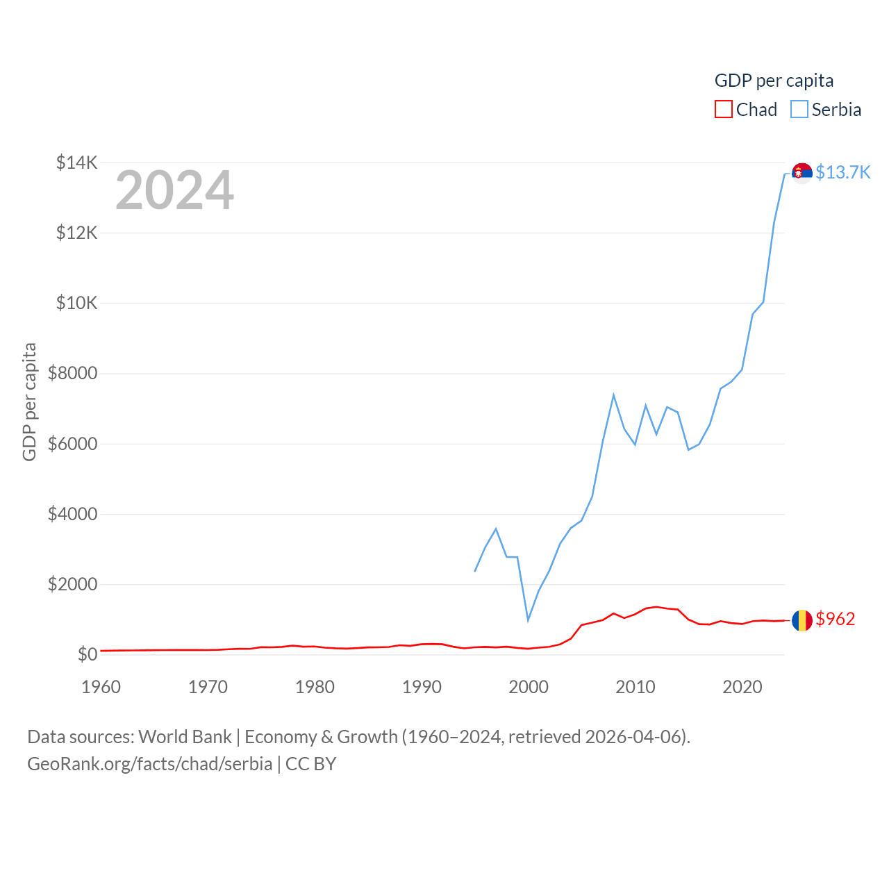 By GDP, Chad ranks 132/197 ($19.5B) and Serbia ranks 76/197 ($90.1B). By GDP per capita, Chad ranks 182/197 ($962), while Serbia ranks 73/197 ($13,679).