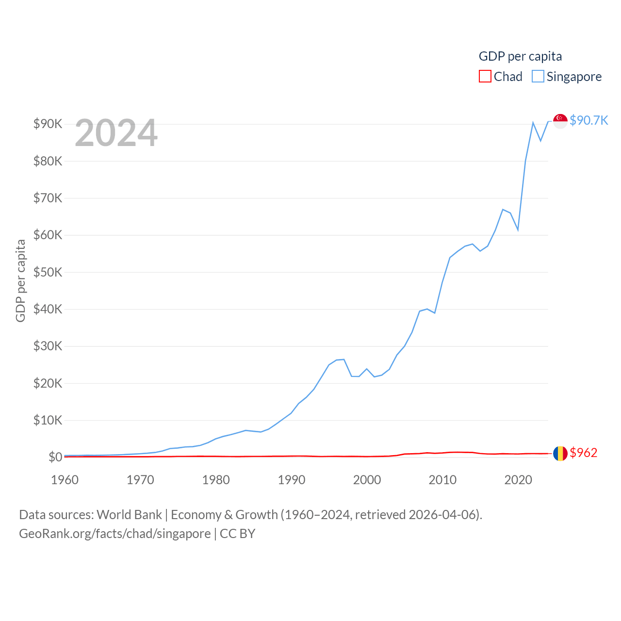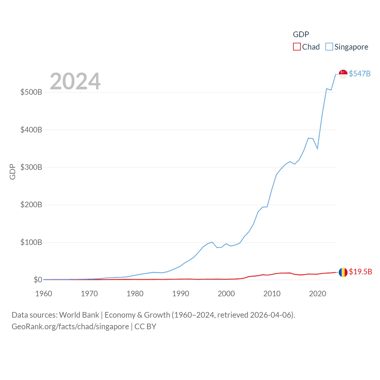 By GDP, Chad ranks 132/197 ($19.5B) and Singapore ranks 28/197 ($547B). By GDP per capita, Chad ranks 182/197 ($962), while Singapore ranks 7/197 ($90,674).