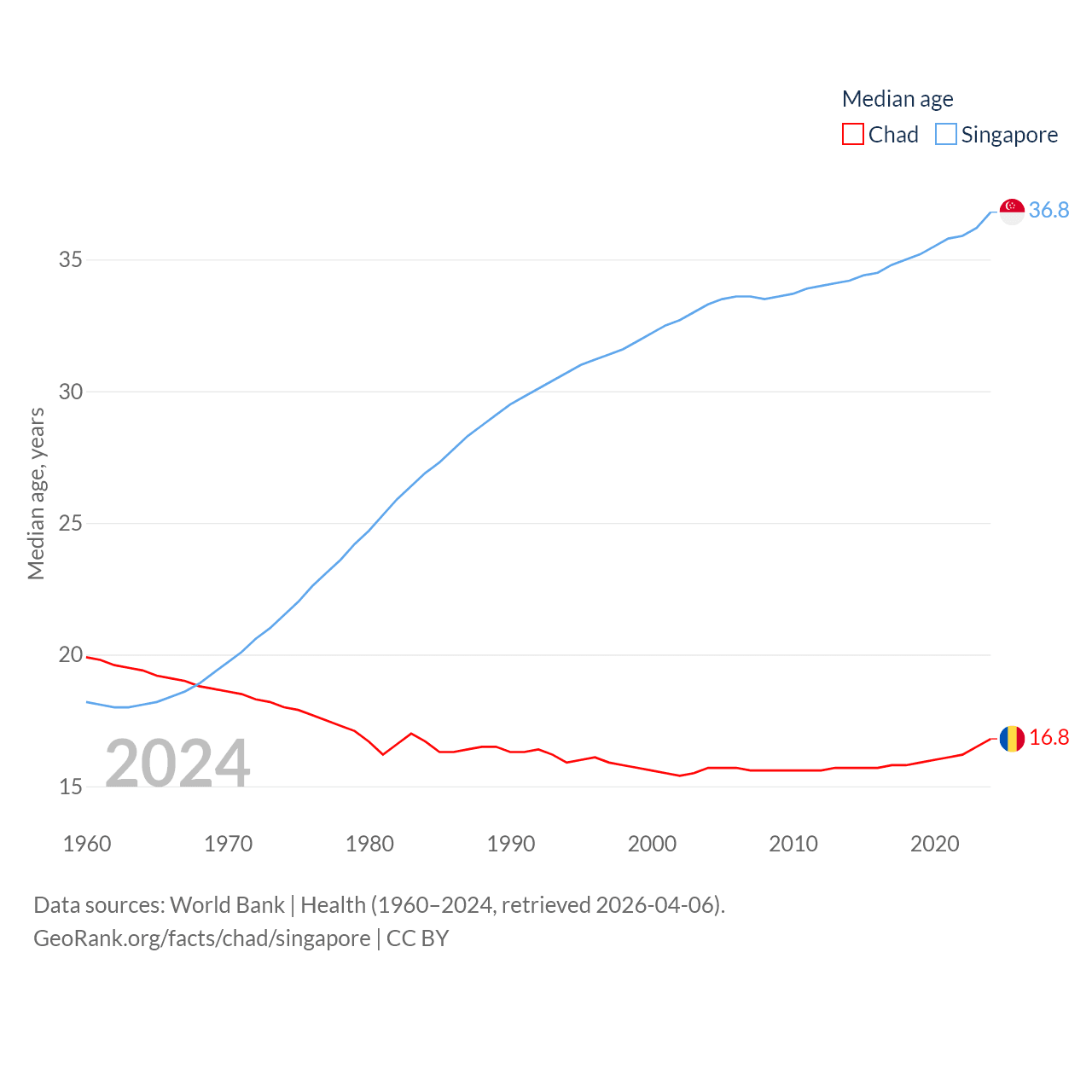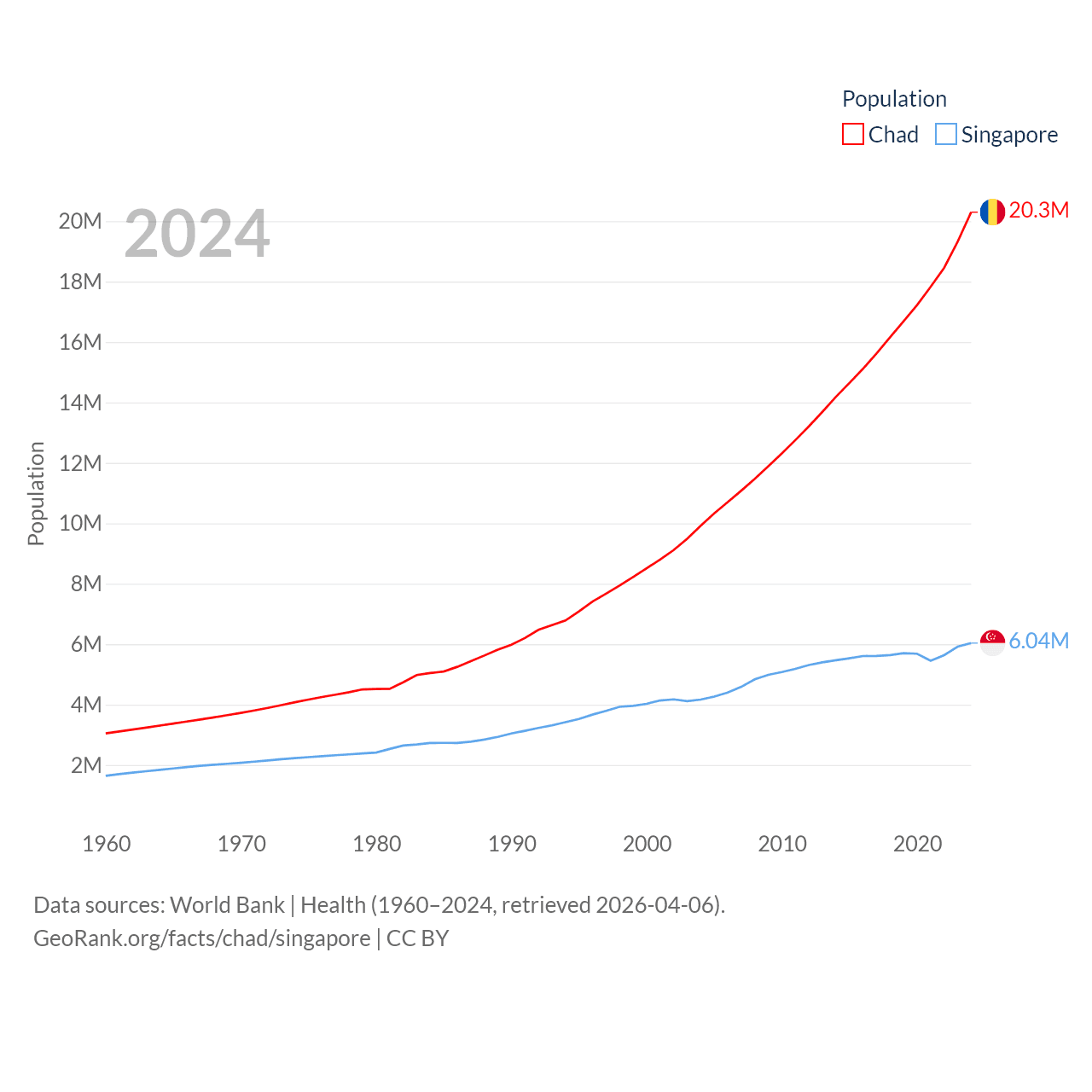 Chad has a population of 20.3M (ranked 65/197), compared with 6.04M in Singapore (ranked 113/197). Chad's land area is 486,180 sq mi versus 277.2 sq mi for Singapore (ranked 21st vs. 177th).