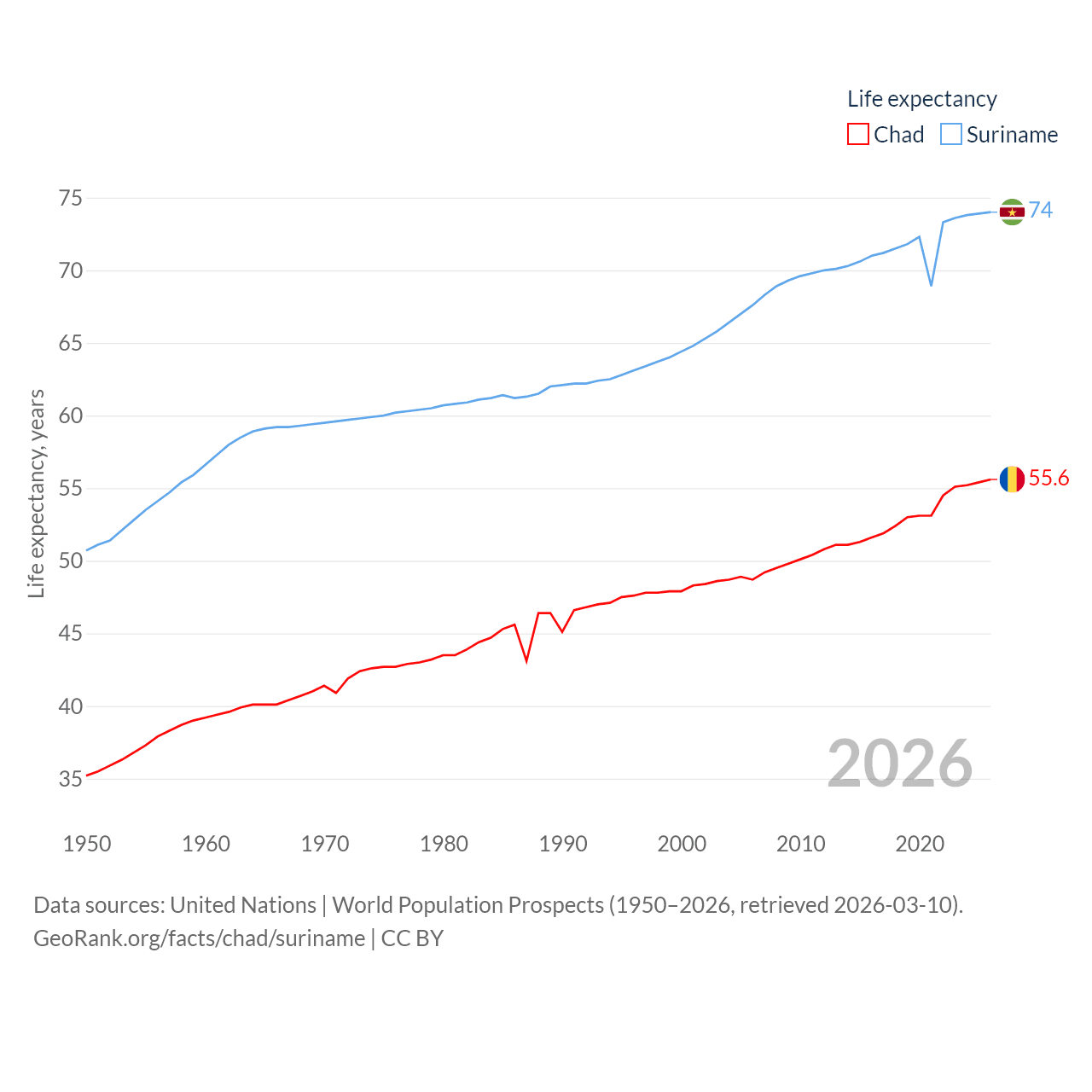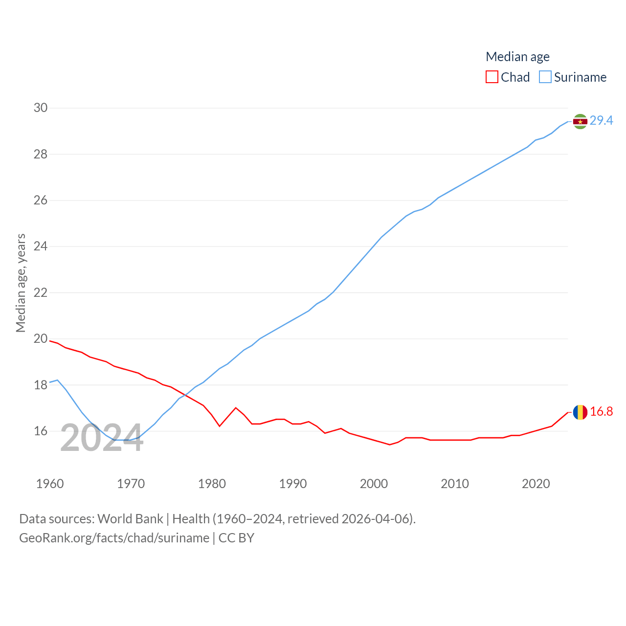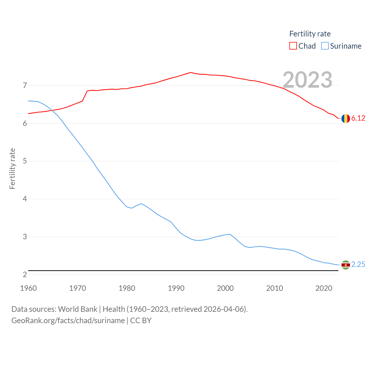 Chad has a population of 20.3M (ranked 65/197), compared with 634K in Suriname (ranked 165/197). Chad's land area is 486,180 sq mi versus 61,972 sq mi for Suriname (ranked 21st vs. 90th).