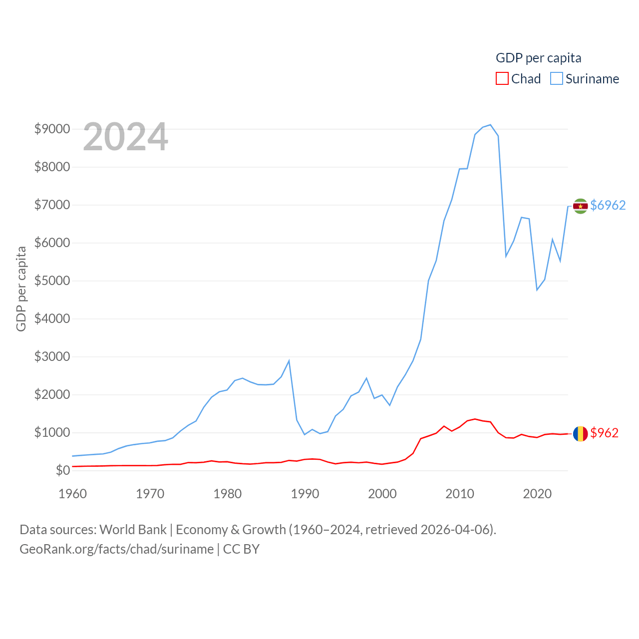 By GDP, Chad ranks 132/197 ($19.5B) and Suriname ranks 164/197 ($4.42B). By GDP per capita, Chad ranks 182/197 ($962), while Suriname ranks 102/197 ($6,962).