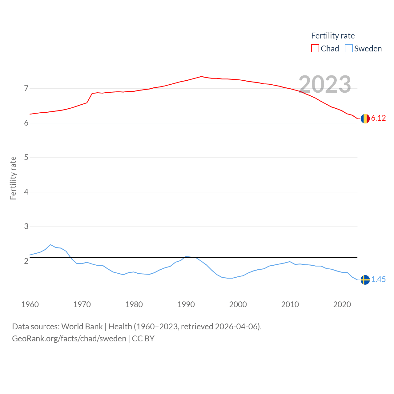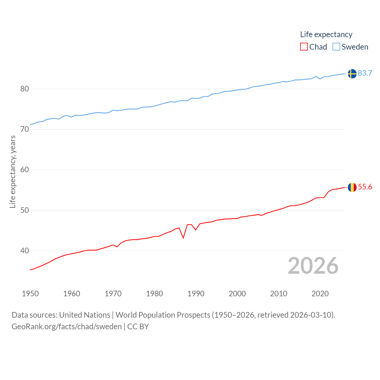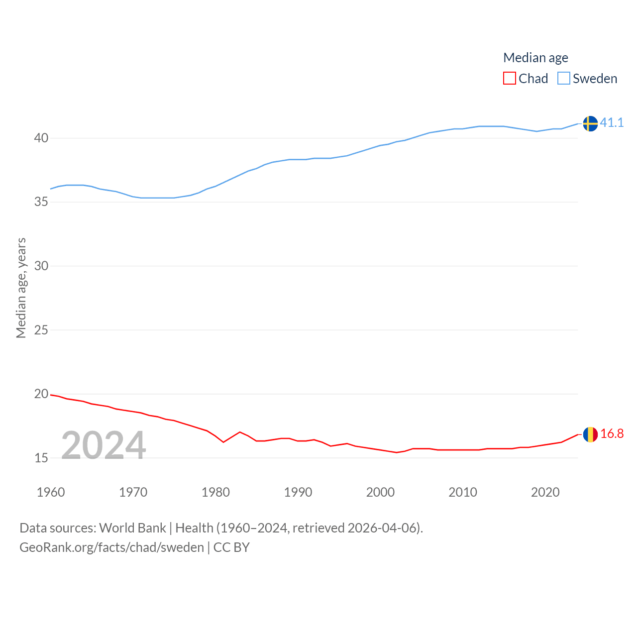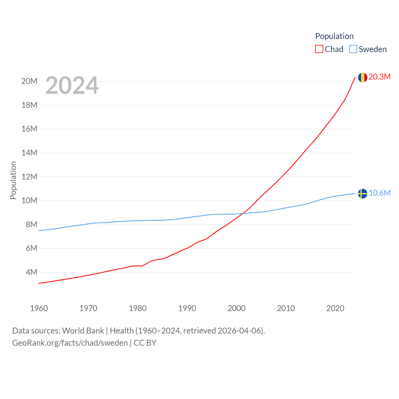 Chad has a population of 20.3M (ranked 65/197), compared with 10.6M in Sweden (ranked 93/197). Chad's land area is 486,180 sq mi versus 157,248 sq mi for Sweden (ranked 21st vs. 58th).