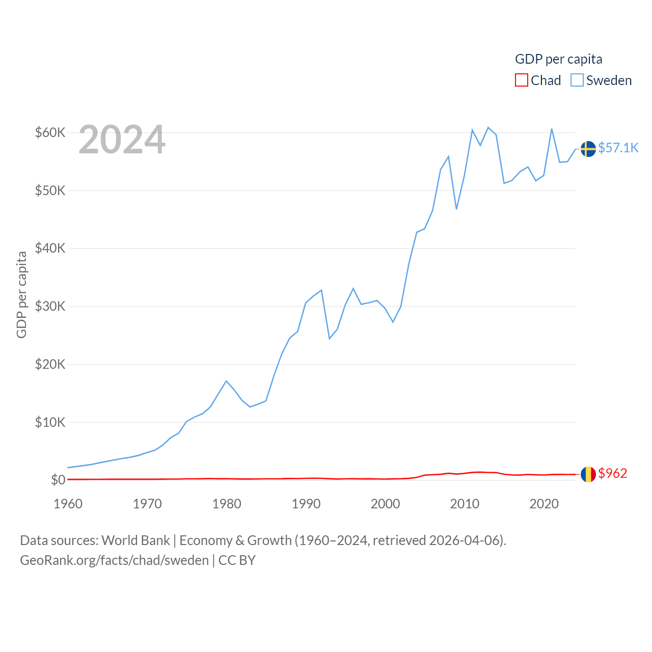 By GDP, Chad ranks 132/197 ($19.5B) and Sweden ranks 26/197 ($604B). By GDP per capita, Chad ranks 182/197 ($962), while Sweden ranks 17/197 ($57,117).