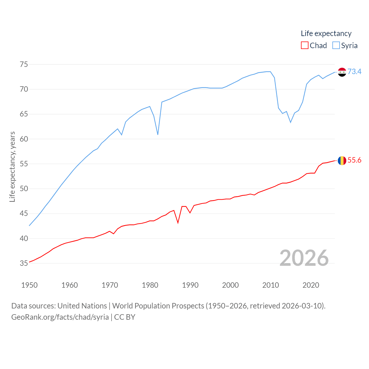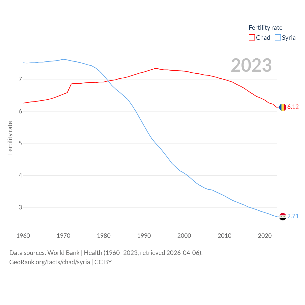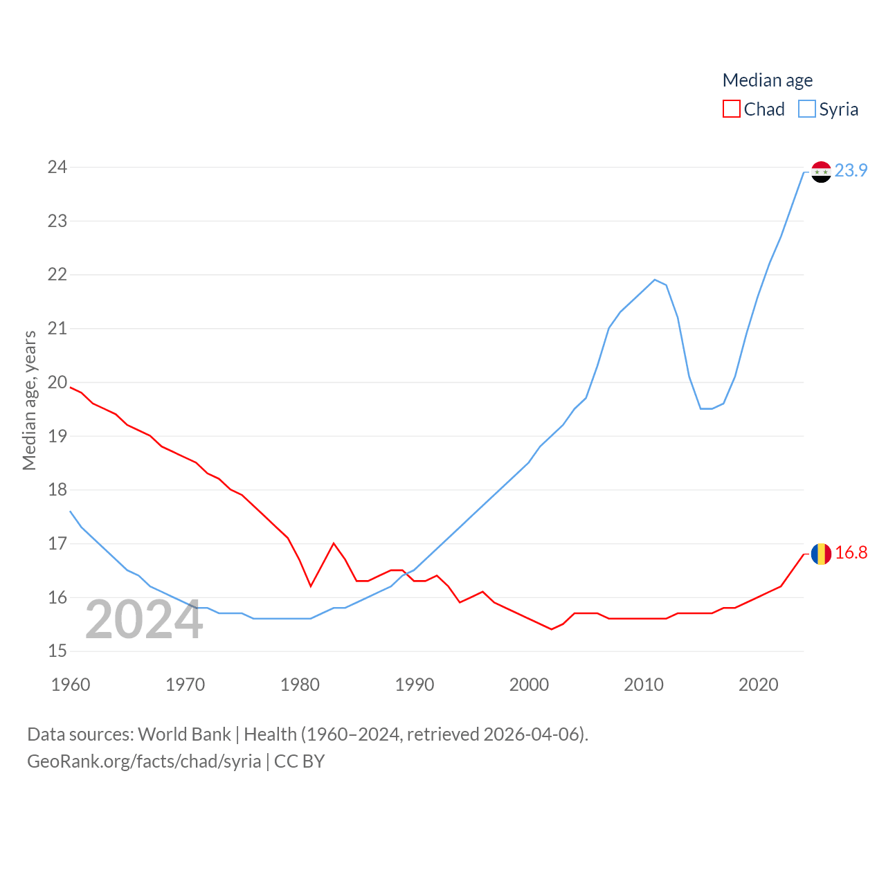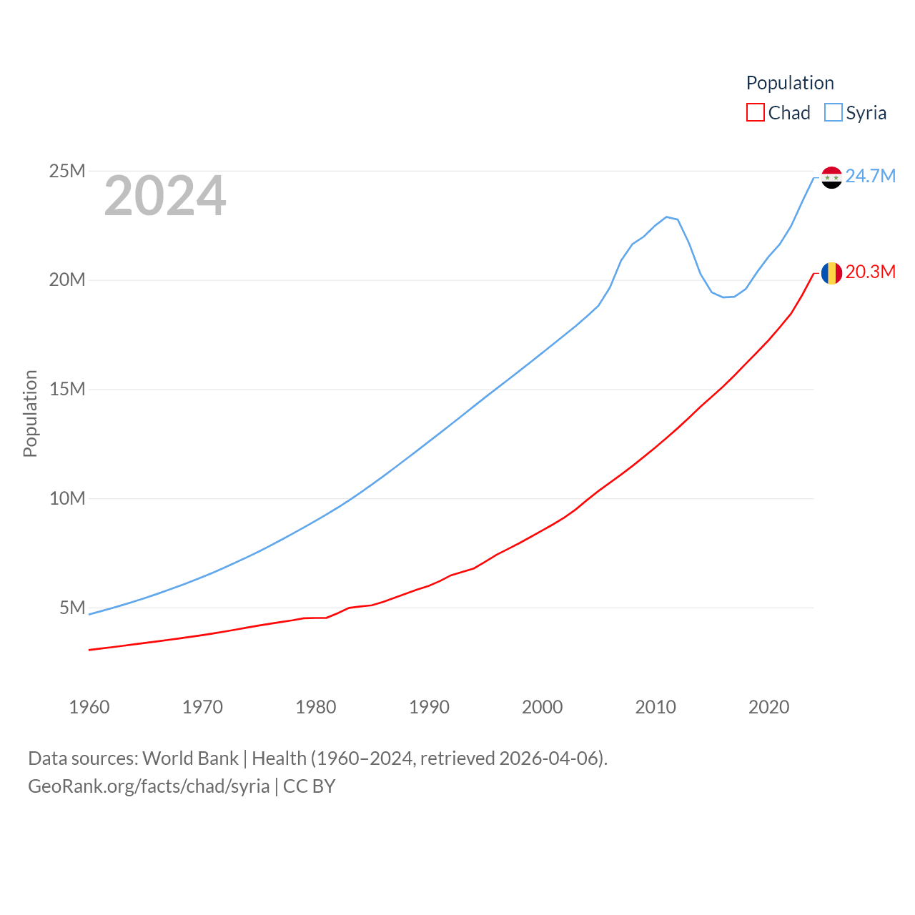 Chad has a population of 20.3M (ranked 65/197), compared with 24.7M in Syria (ranked 57/197). Chad's land area is 486,180 sq mi versus 70,900 sq mi for Syria (ranked 21st vs. 87th).