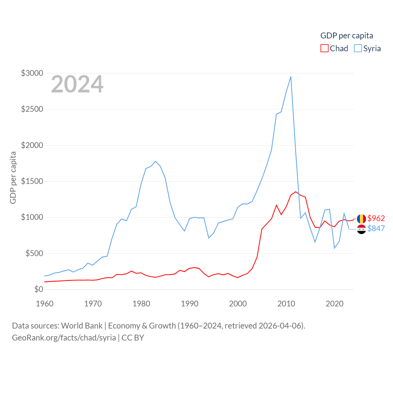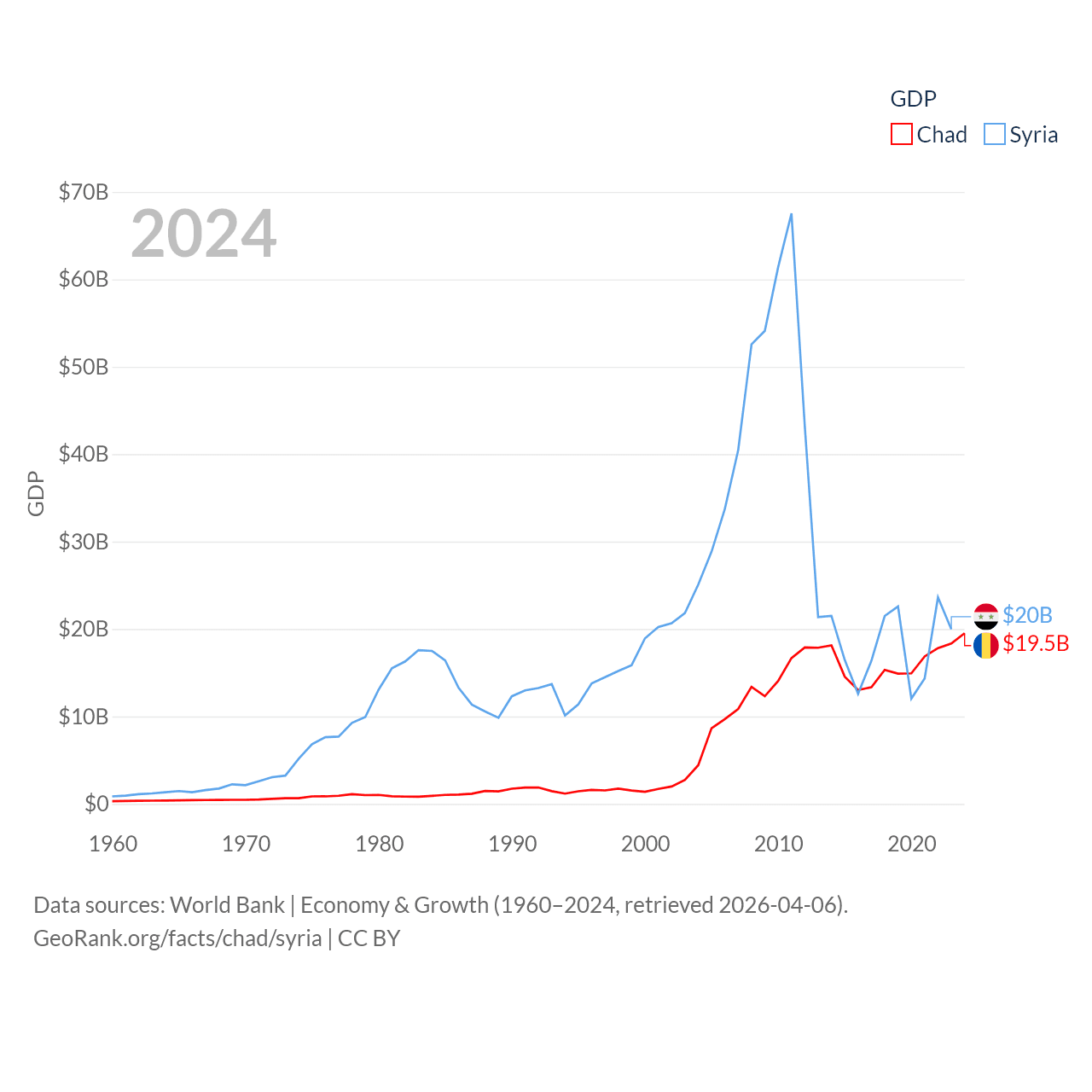 By GDP, Chad ranks 132/197 ($19.5B) and Syria ranks 129/197 ($20B). By GDP per capita, Chad ranks 182/197 ($962), while Syria ranks 185/197 ($847).