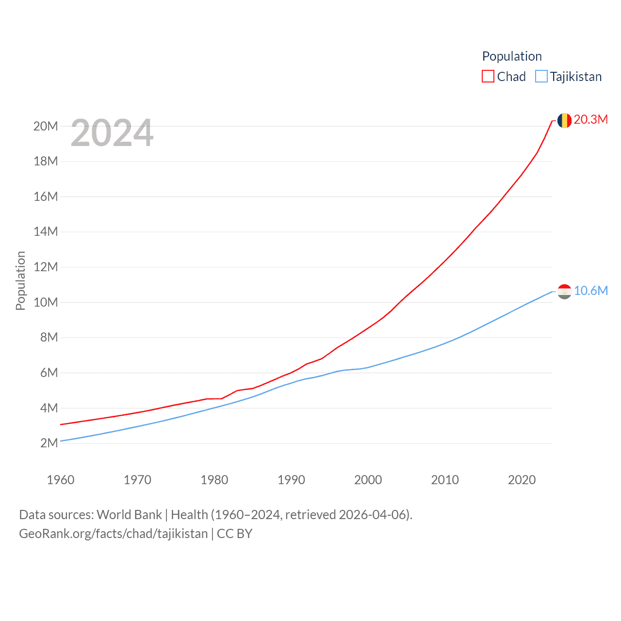 Chad has a population of 20.3M (ranked 65/197), compared with 10.6M in Tajikistan (ranked 91/197). Chad's land area is 486,180 sq mi versus 53,587 sq mi for Tajikistan (ranked 21st vs. 93rd).