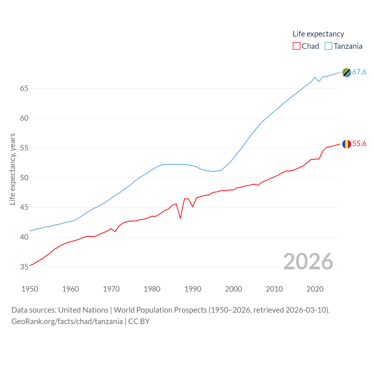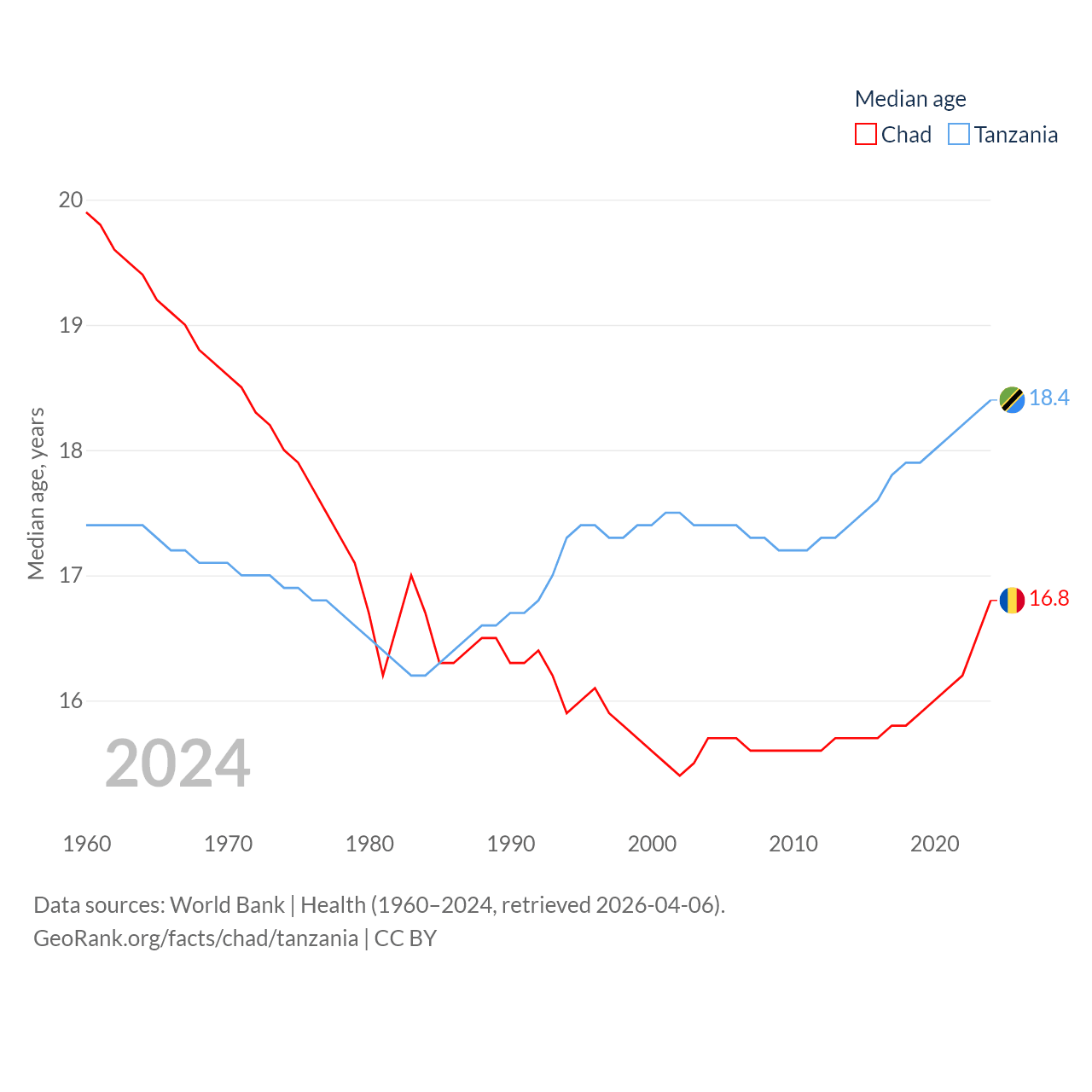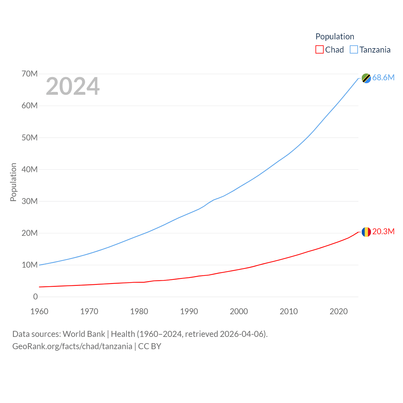 Chad has a population of 20.3M (ranked 65/197), compared with 68.6M in Tanzania (ranked 22/197). Chad's land area is 486,180 sq mi versus 342,009 sq mi for Tanzania (ranked 21st vs. 31st).