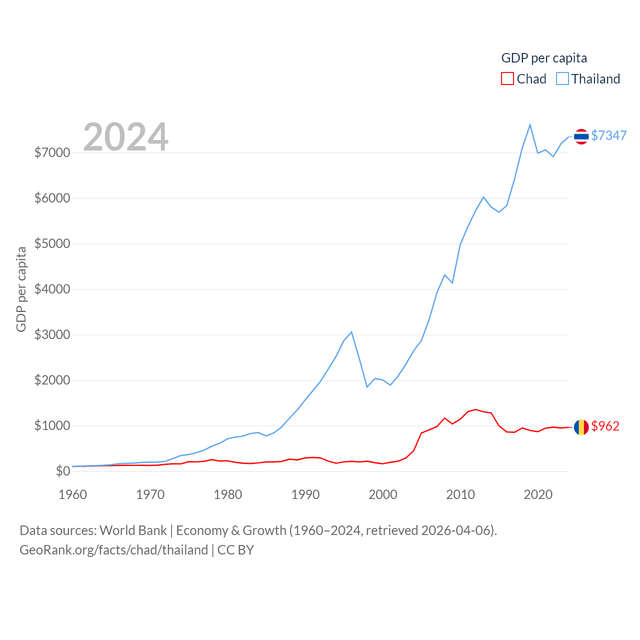 By GDP, Chad ranks 132/197 ($19.5B) and Thailand ranks 31/197 ($527B). By GDP per capita, Chad ranks 182/197 ($962), while Thailand ranks 100/197 ($7,347).