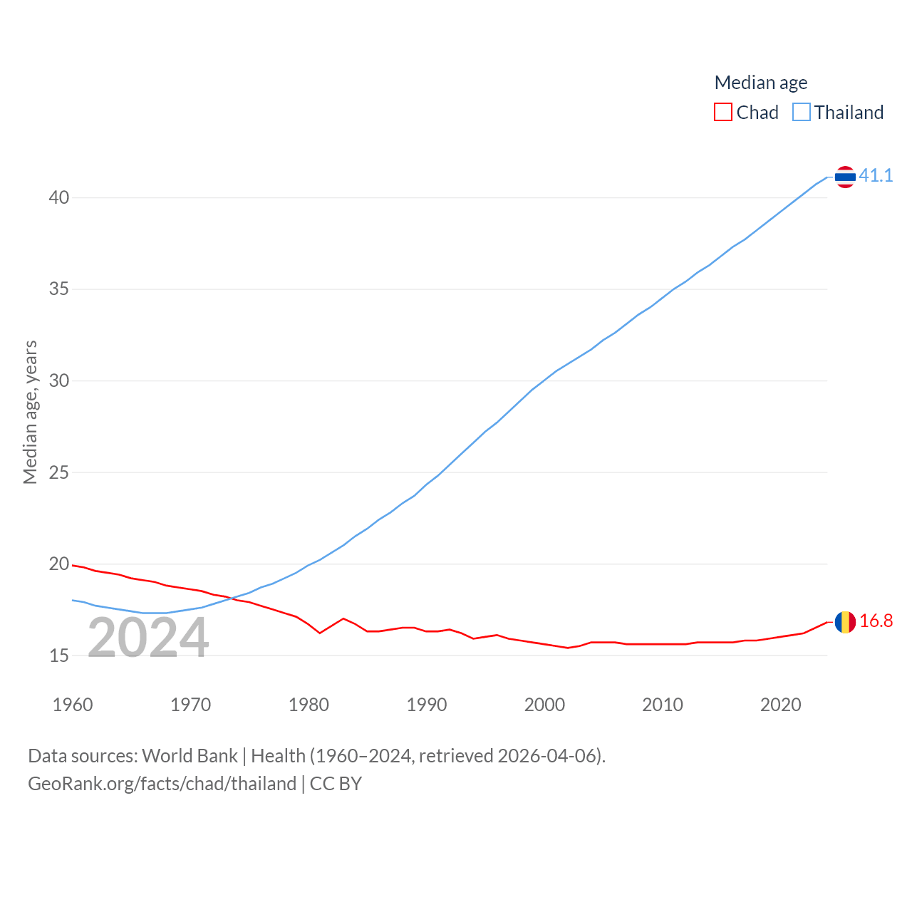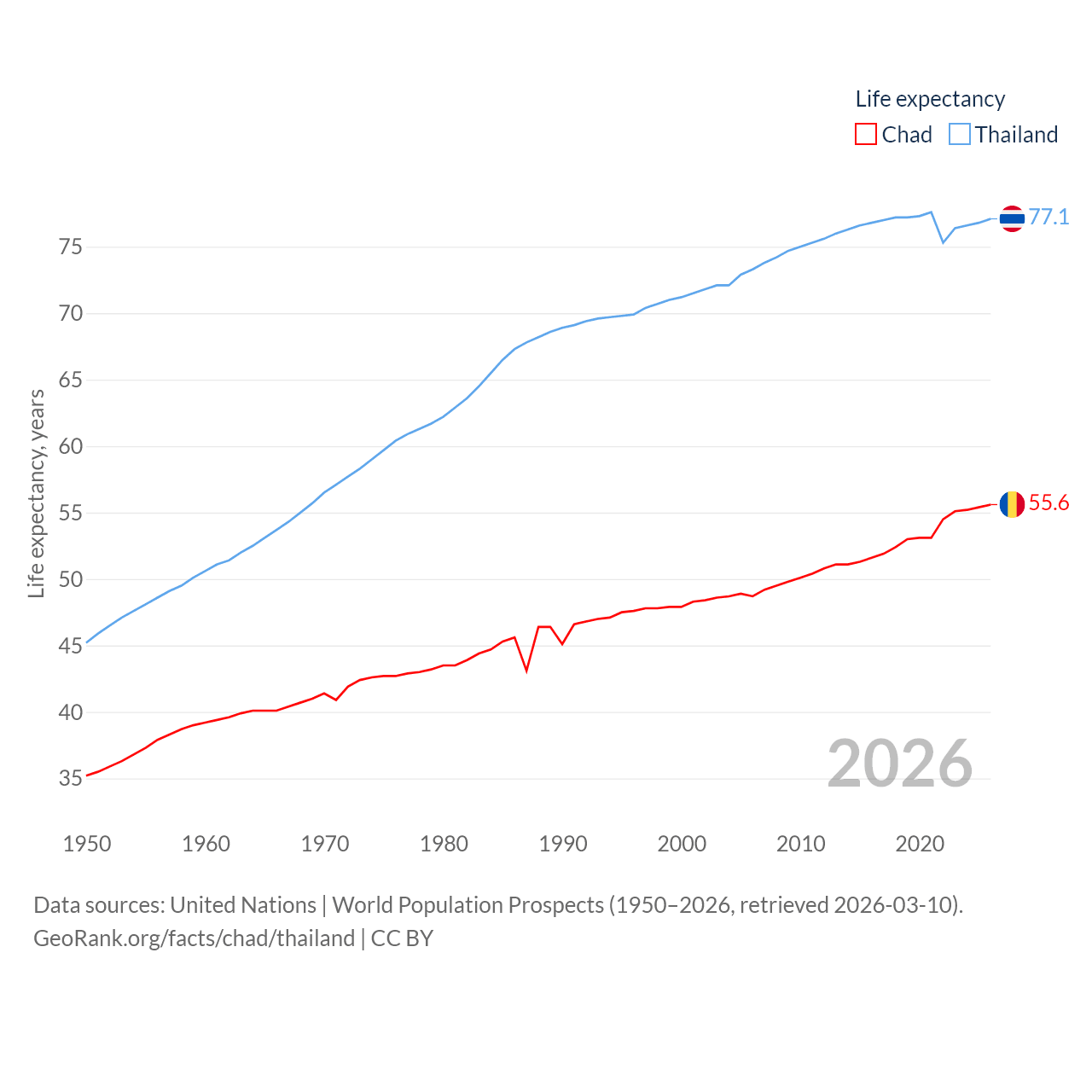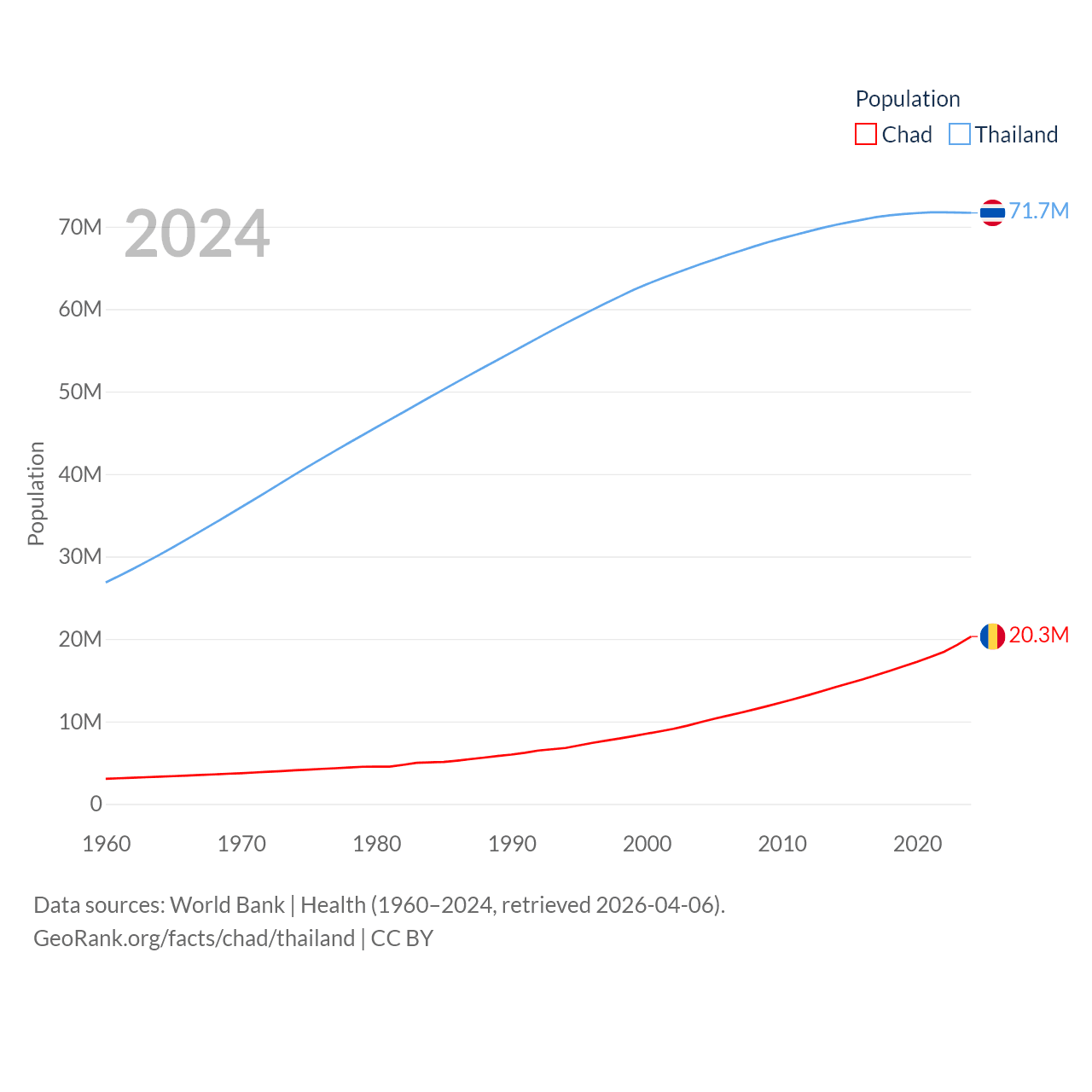 Chad has a population of 20.3M (ranked 65/197), compared with 71.7M in Thailand (ranked 20/197). Chad's land area is 486,180 sq mi versus 197,256 sq mi for Thailand (ranked 21st vs. 50th).