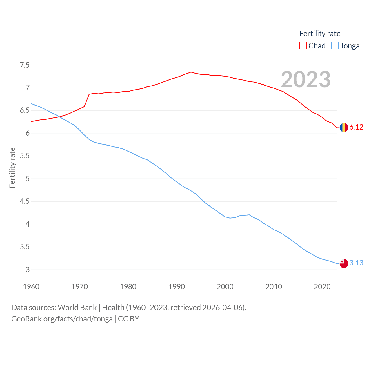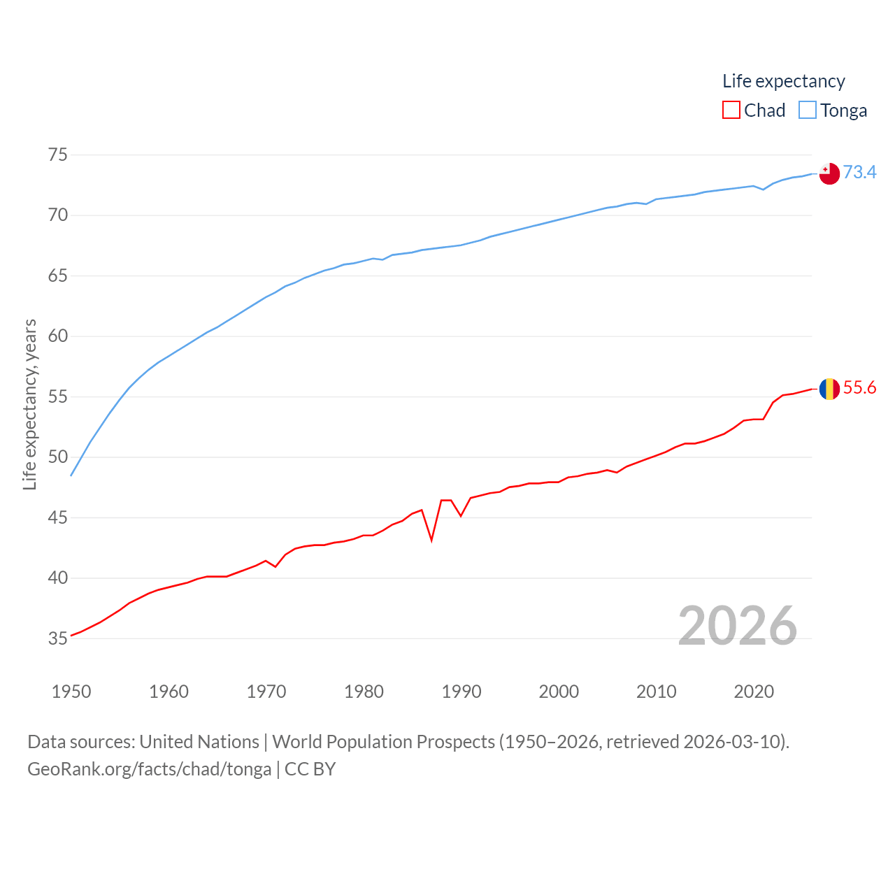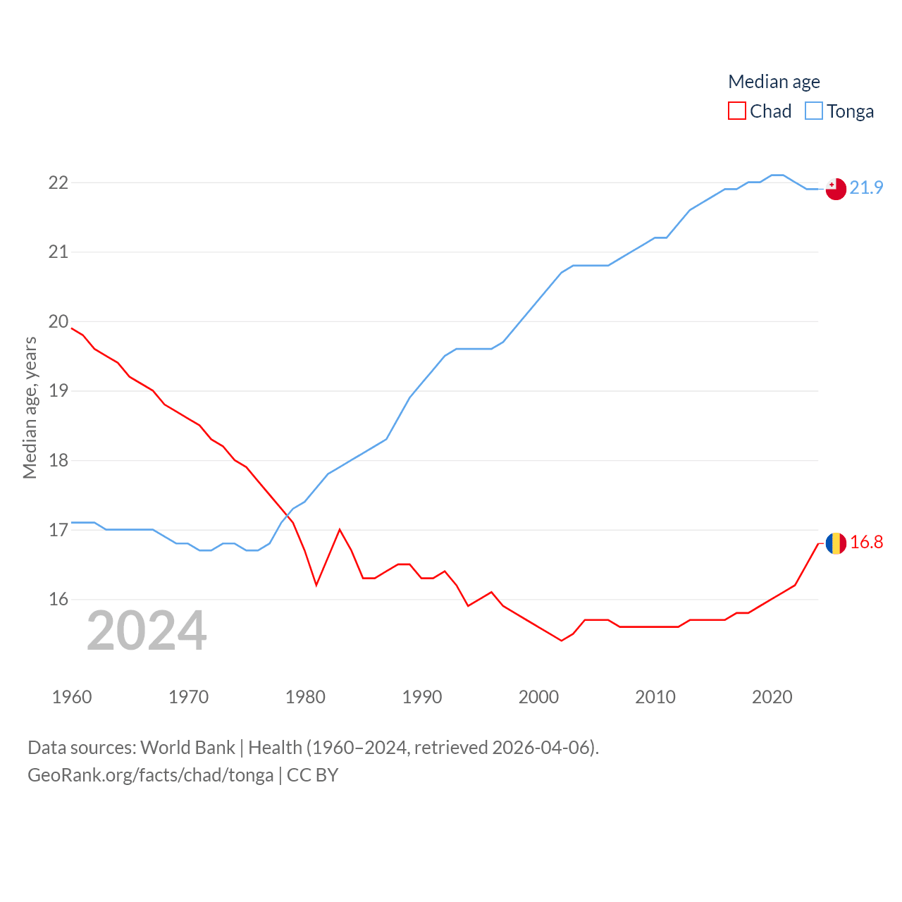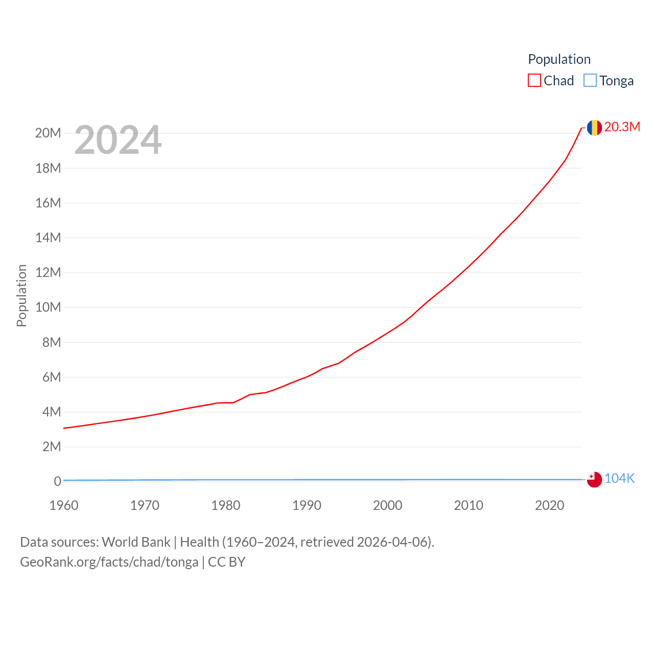 Chad has a population of 20.3M (ranked 65/197), compared with 104K in Tonga (ranked 183/197). Chad's land area is 486,180 sq mi versus 278 sq mi for Tonga (ranked 21st vs. 176th).