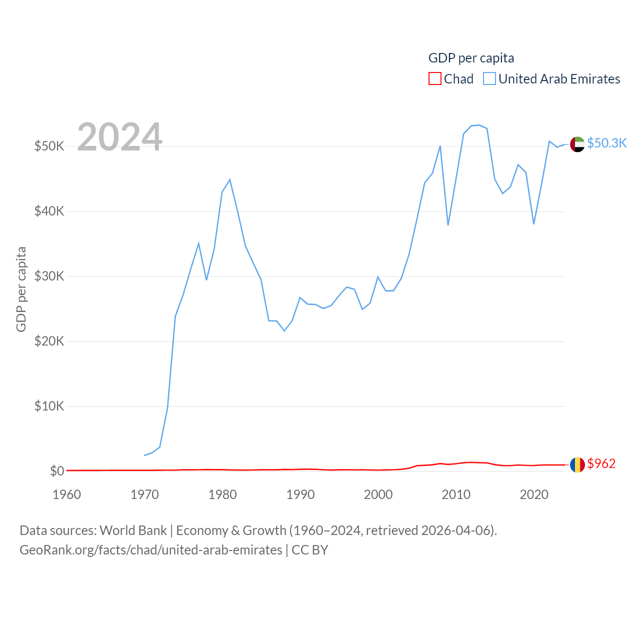 By GDP, Chad ranks 132/197 ($19.5B) and The United Arab Emirates ranks 27/197 ($552B). By GDP per capita, Chad ranks 182/197 ($962), while The United Arab Emirates ranks 24/197 ($50,274).