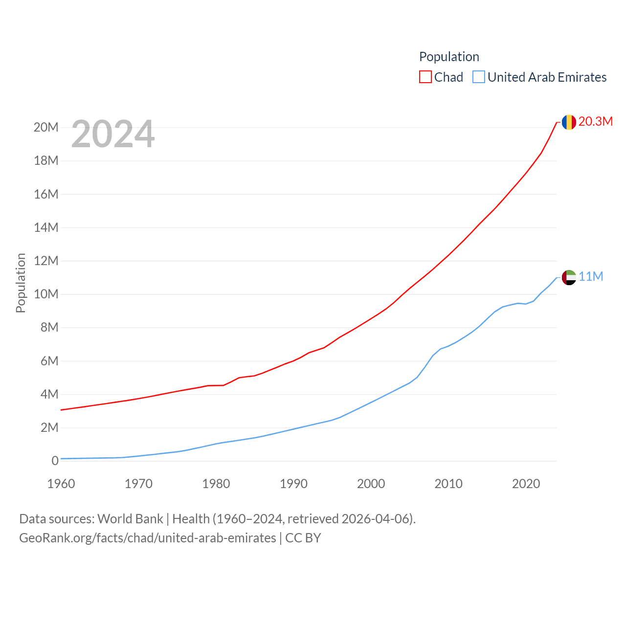 Chad has a population of 20.3M (ranked 65/197), compared with 11M in The United Arab Emirates (ranked 86/197). Chad's land area is 486,180 sq mi versus 27,421 sq mi for The United Arab Emirates (ranked 21st vs. 117th).