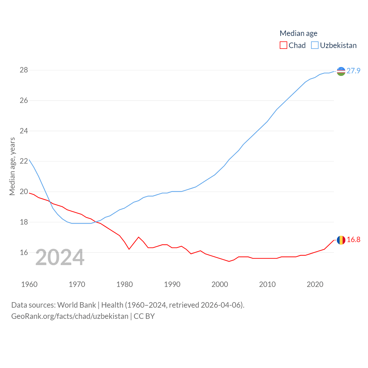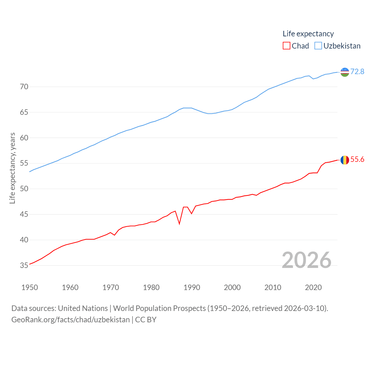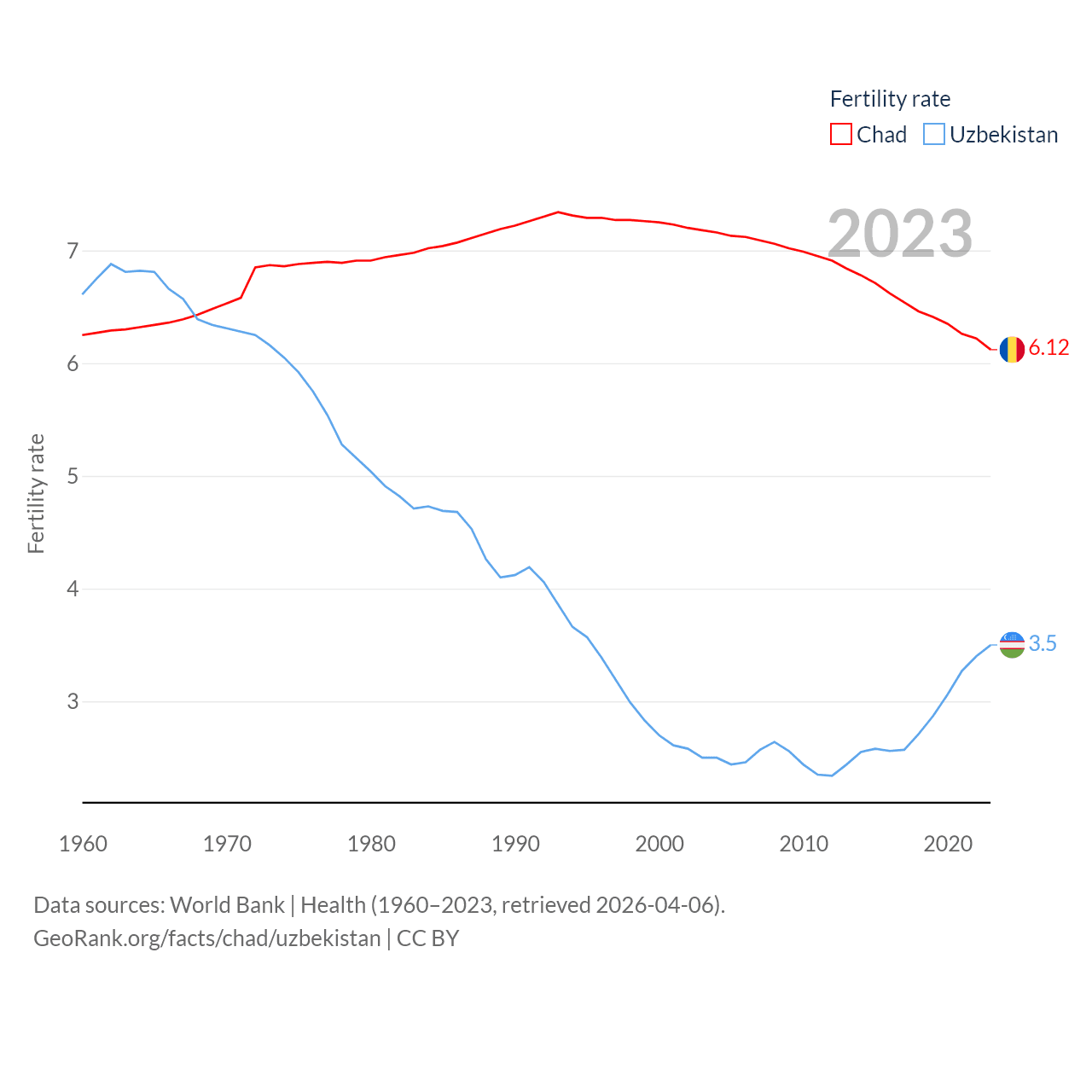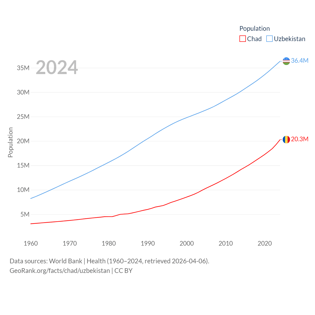 Chad has a population of 20.3M (ranked 65/197), compared with 36.4M in Uzbekistan (ranked 43/197). Chad's land area is 486,180 sq mi versus 170,136 sq mi for Uzbekistan (ranked 21st vs. 56th).