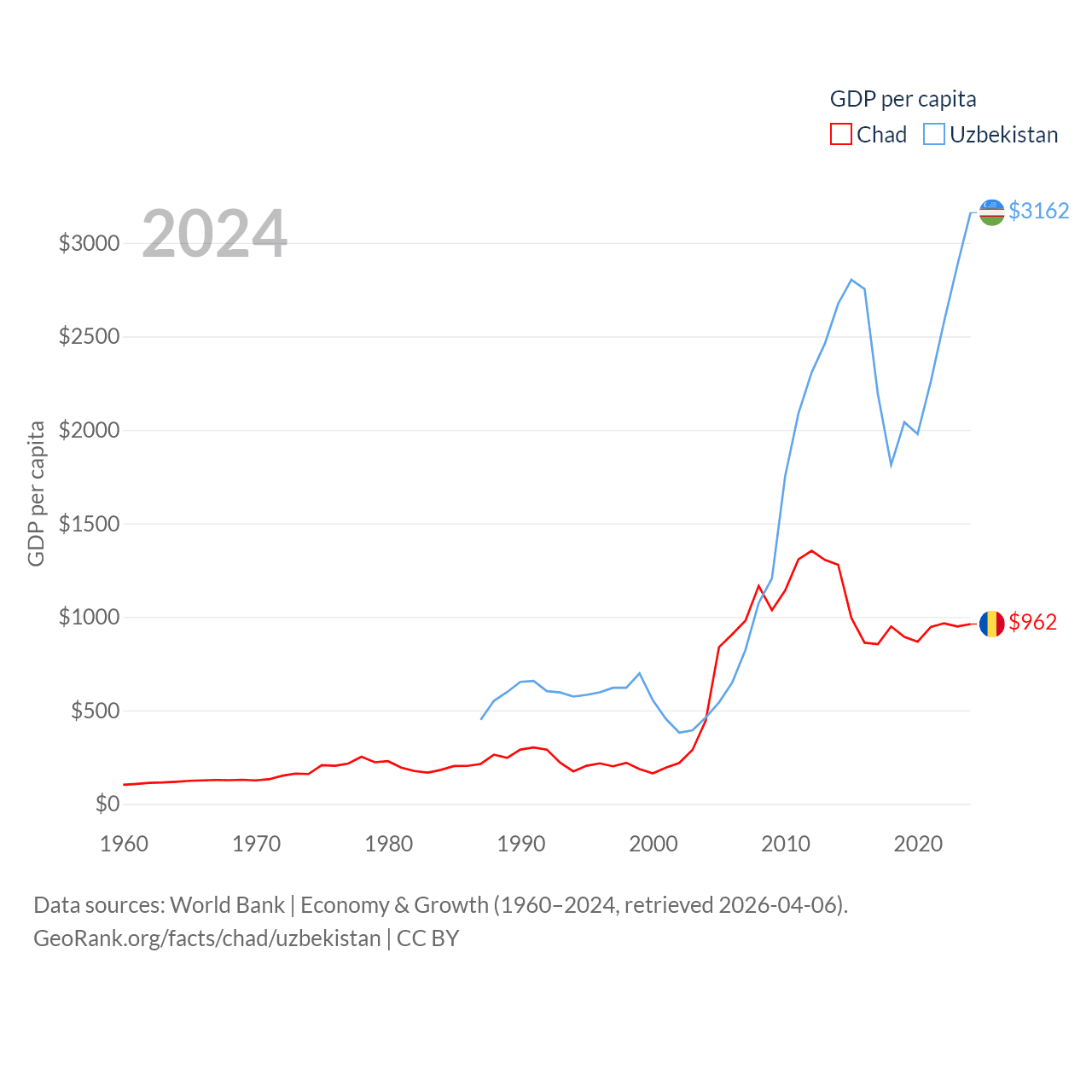 By GDP, Chad ranks 132/197 ($19.5B) and Uzbekistan ranks 66/197 ($115B). By GDP per capita, Chad ranks 182/197 ($962), while Uzbekistan ranks 139/197 ($3,162).
