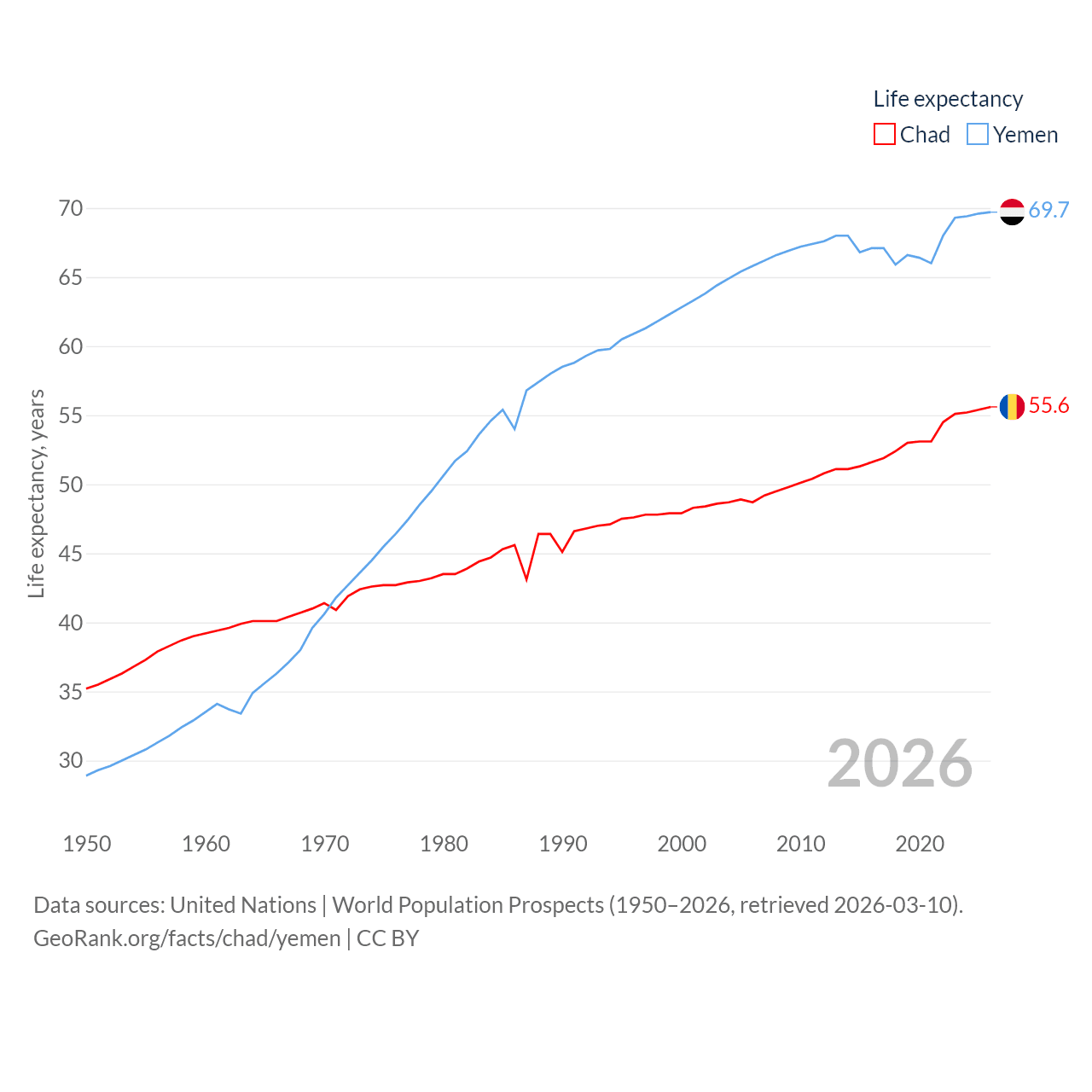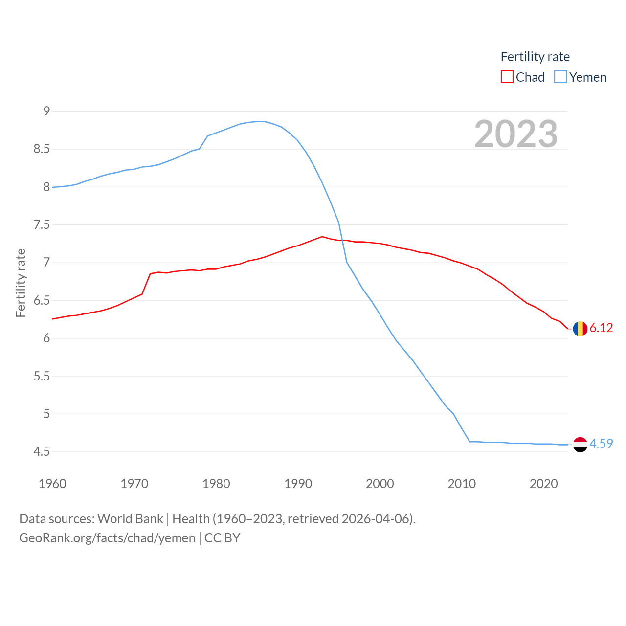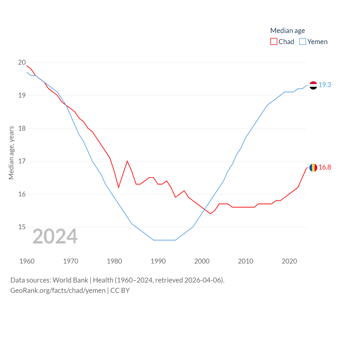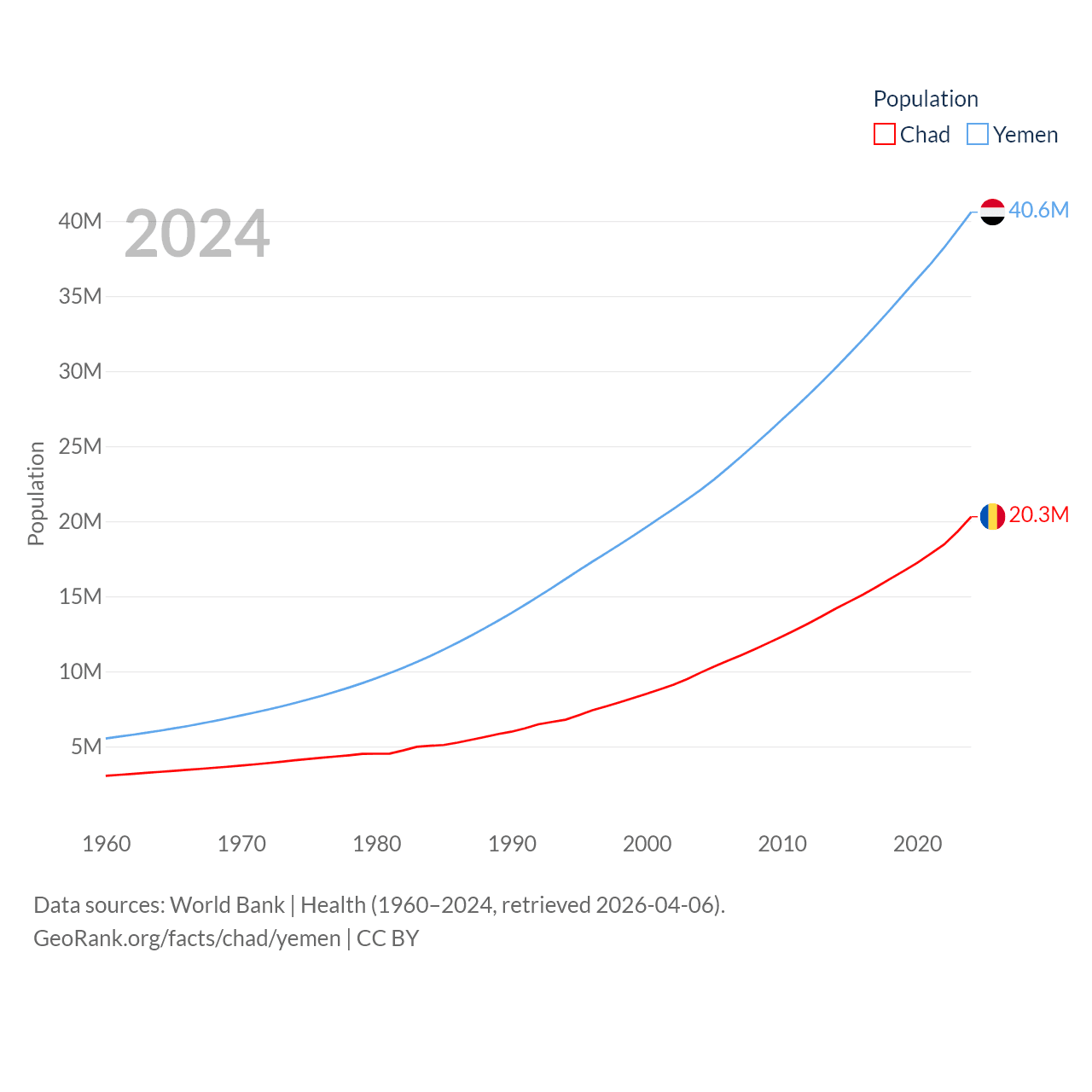 Chad has a population of 20.3M (ranked 65/197), compared with 40.6M in Yemen (ranked 38/197). Chad's land area is 486,180 sq mi versus 203,850 sq mi for Yemen (ranked 21st vs. 49th).
