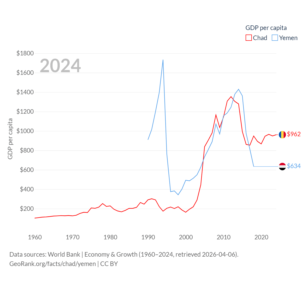 By GDP, Chad ranks 132/197 ($19.5B) and Yemen ranks 125/197 ($21.6B). By GDP per capita, Chad ranks 182/197 ($962), while Yemen ranks 191/197 ($634).