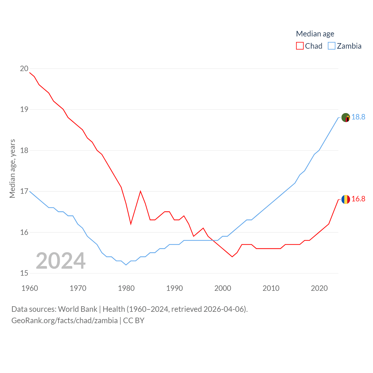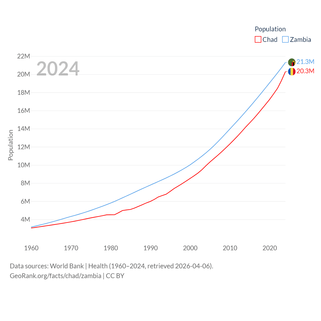 Chad has a population of 20.3M (ranked 65/197), compared with 21.3M in Zambia (ranked 63/197). Chad's land area is 486,180 sq mi versus 287,024 sq mi for Zambia (ranked 21st vs. 37th).