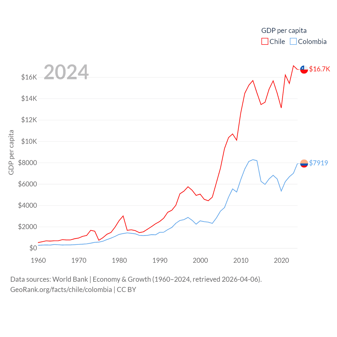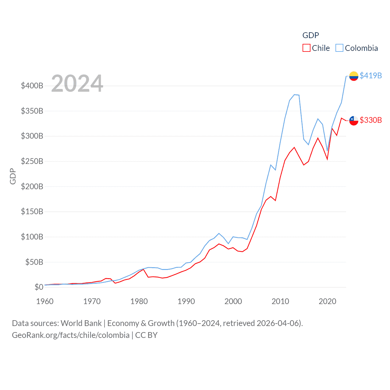 By GDP, Chile ranks 45/197 ($330B) and Colombia ranks 39/197 ($419B). By GDP per capita, Chile ranks 65/197 ($16,710), while Colombia ranks 94/197 ($7,919).