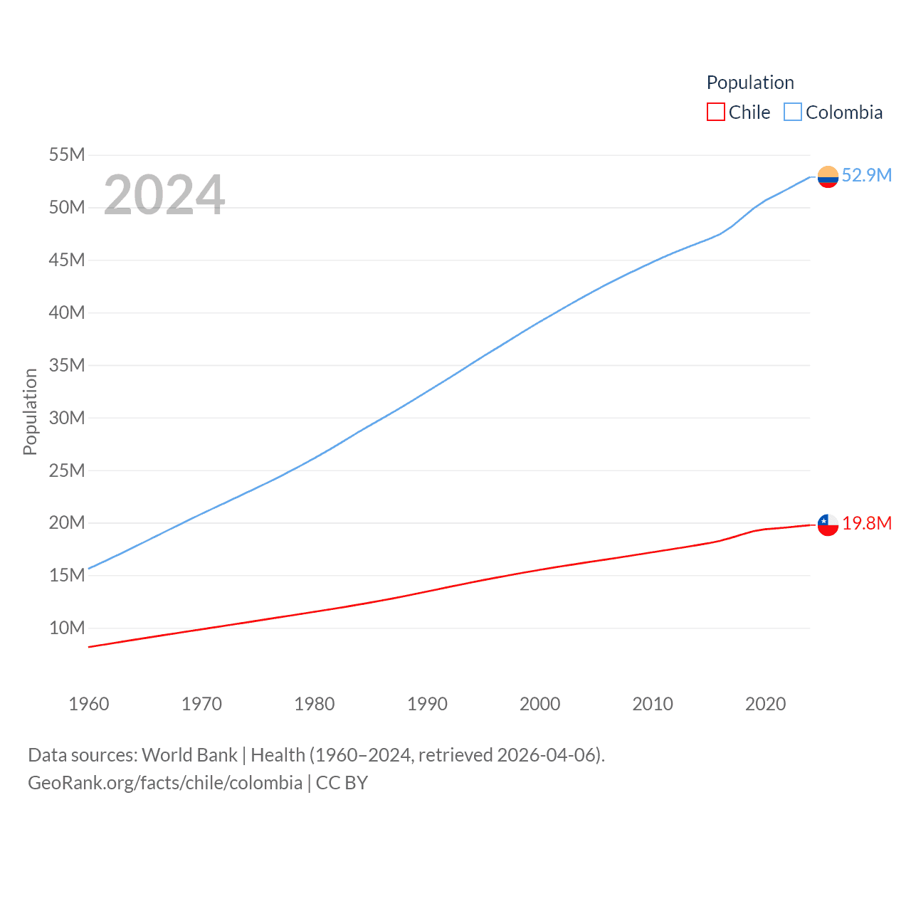 Chile has a population of 19.8M (ranked 66/197), compared with 52.9M in Colombia (ranked 28/197). Chile's land area is 286,809 sq mi versus 428,380 sq mi for Colombia (ranked 38th vs. 26th).