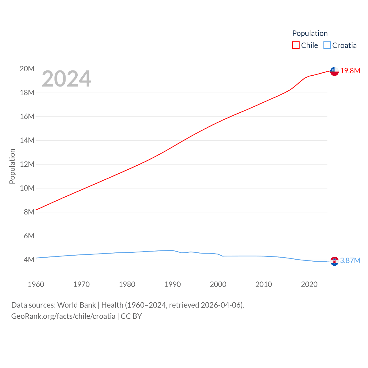 Chile has a population of 19.8M (ranked 66/197), compared with 3.87M in Croatia (ranked 129/197). Chile's land area is 286,809 sq mi versus 21,606 sq mi for Croatia (ranked 38th vs. 123rd).