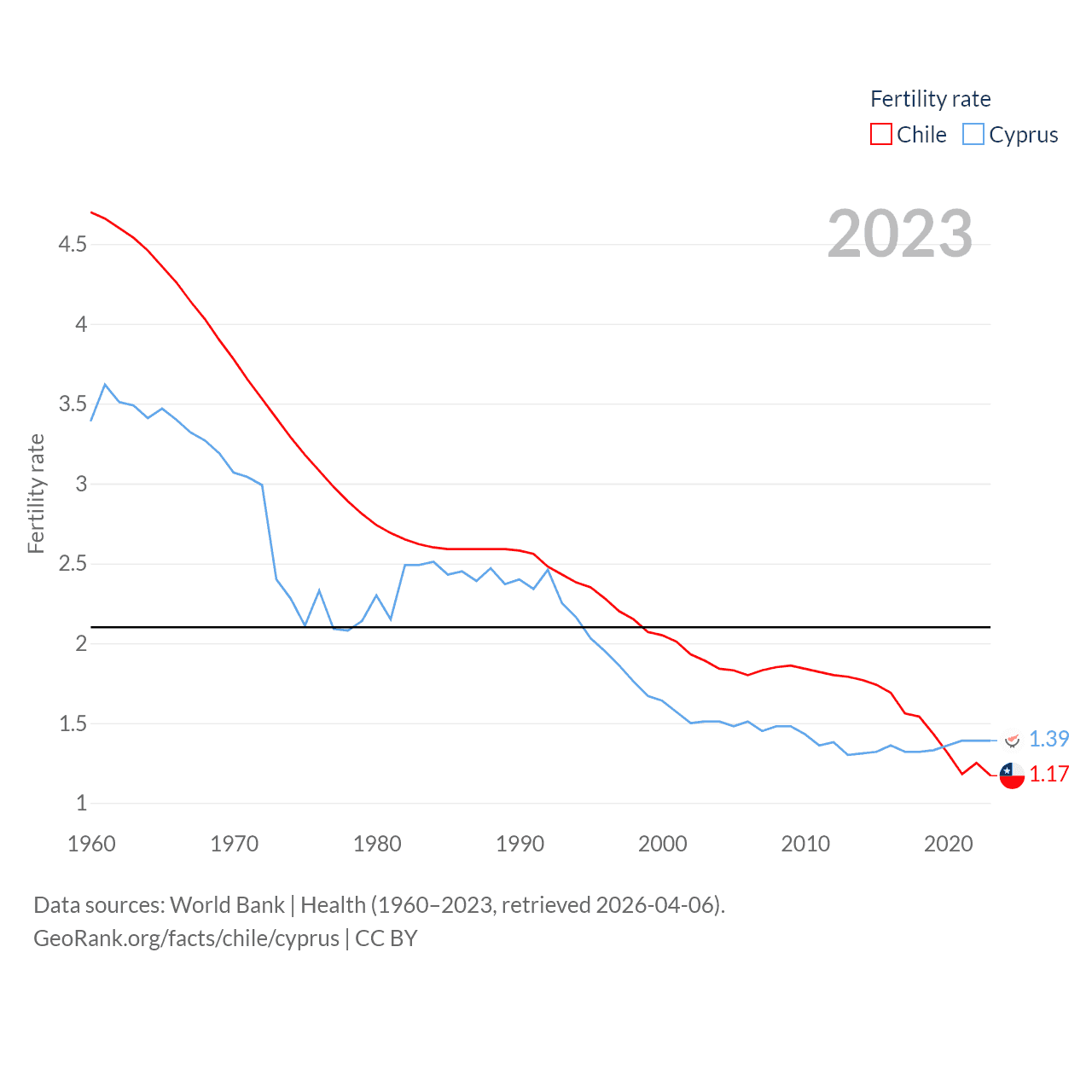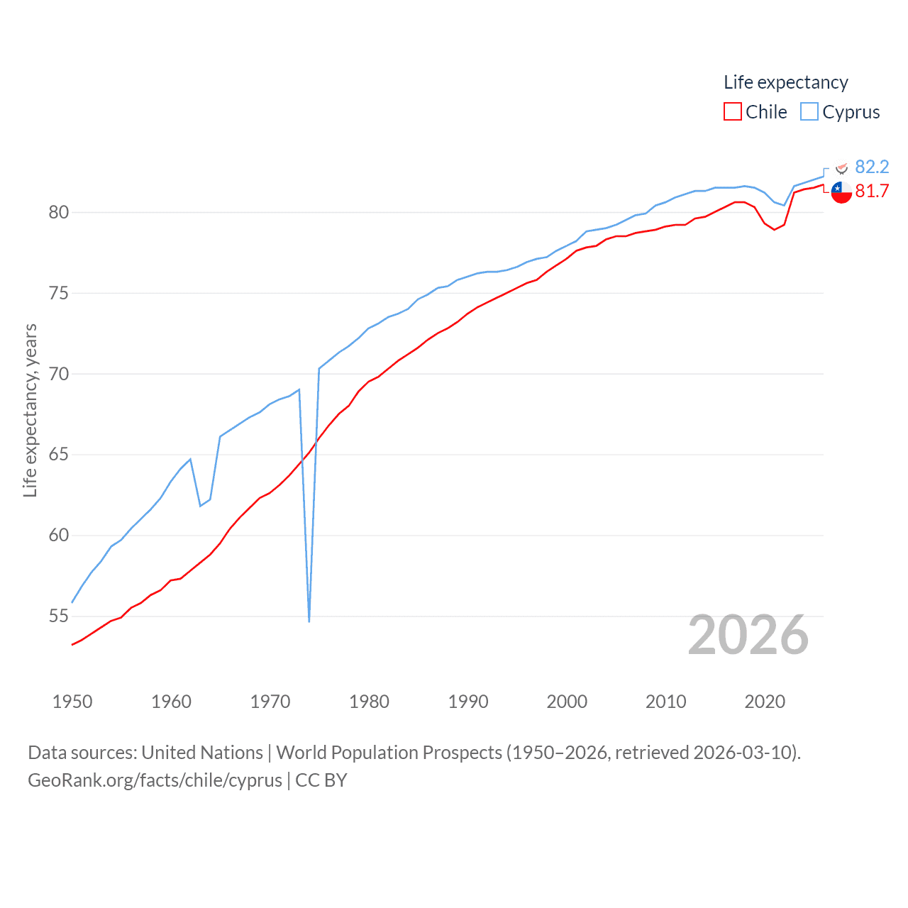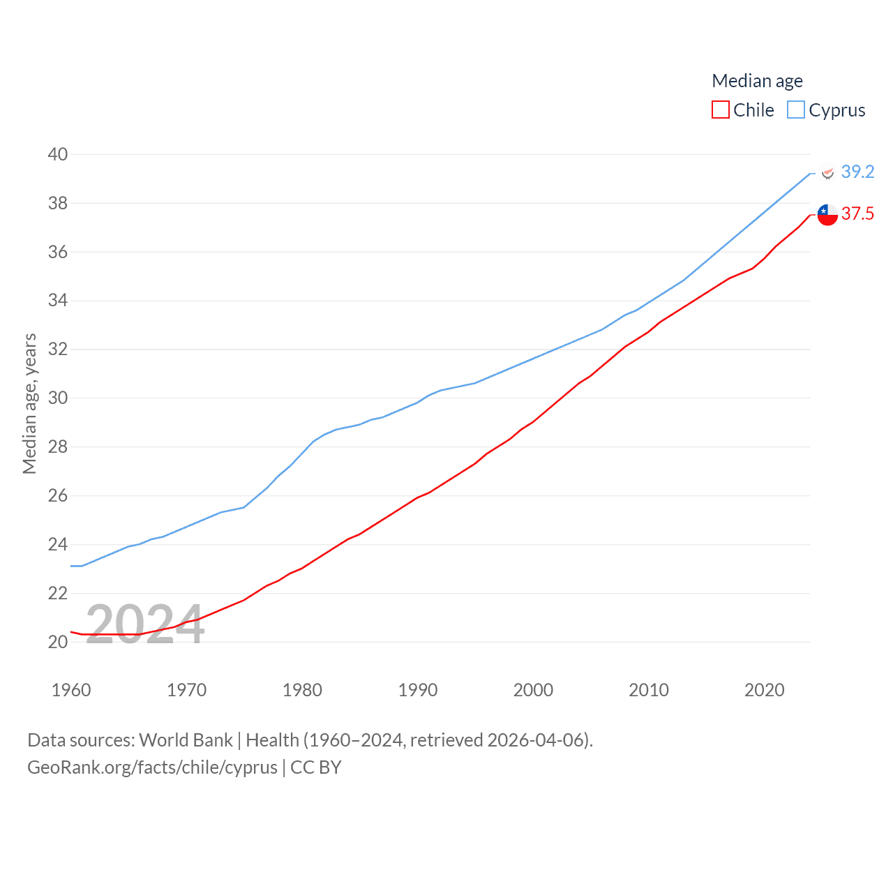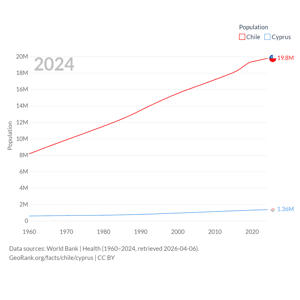 Chile has a population of 19.8M (ranked 66/197), compared with 1.36M in Cyprus (ranked 155/197). Chile's land area is 286,809 sq mi versus 3,568 sq mi for Cyprus (ranked 38th vs. 163rd).