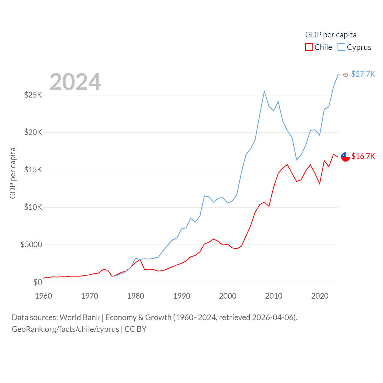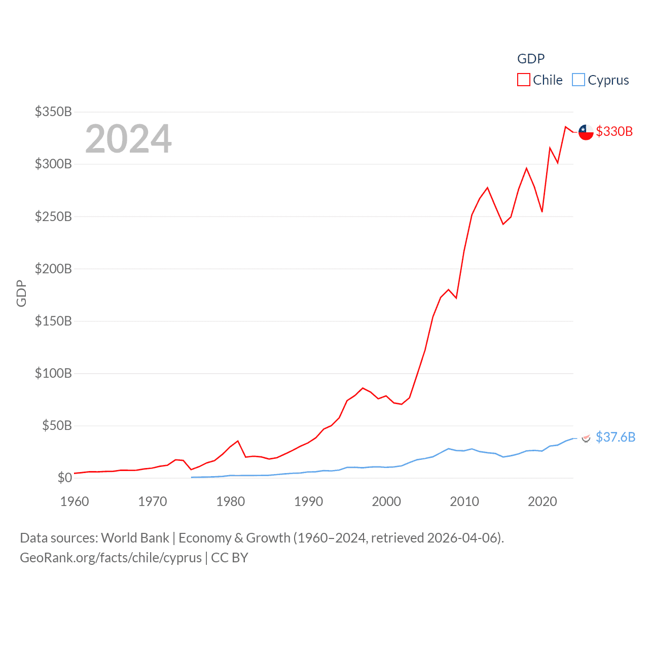 By GDP, Chile ranks 45/197 ($330B) and Cyprus ranks 103/197 ($37.6B). By GDP per capita, Chile ranks 65/197 ($16,710), while Cyprus ranks 45/197 ($27,707).