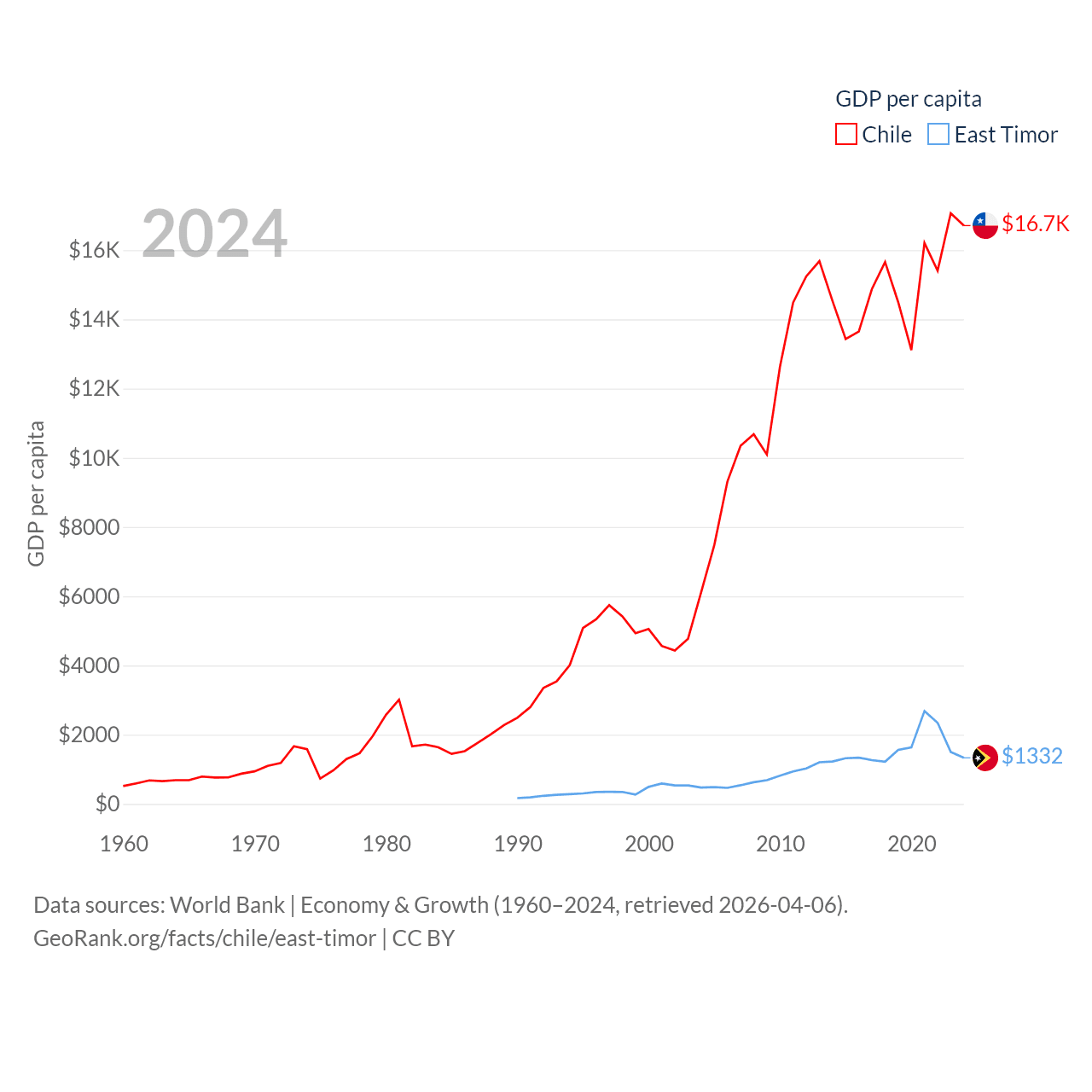 By GDP, Chile ranks 45/197 ($330B) and East Timor ranks 181/197 ($1.87B). By GDP per capita, Chile ranks 65/197 ($16,710), while East Timor ranks 167/197 ($1,332).
