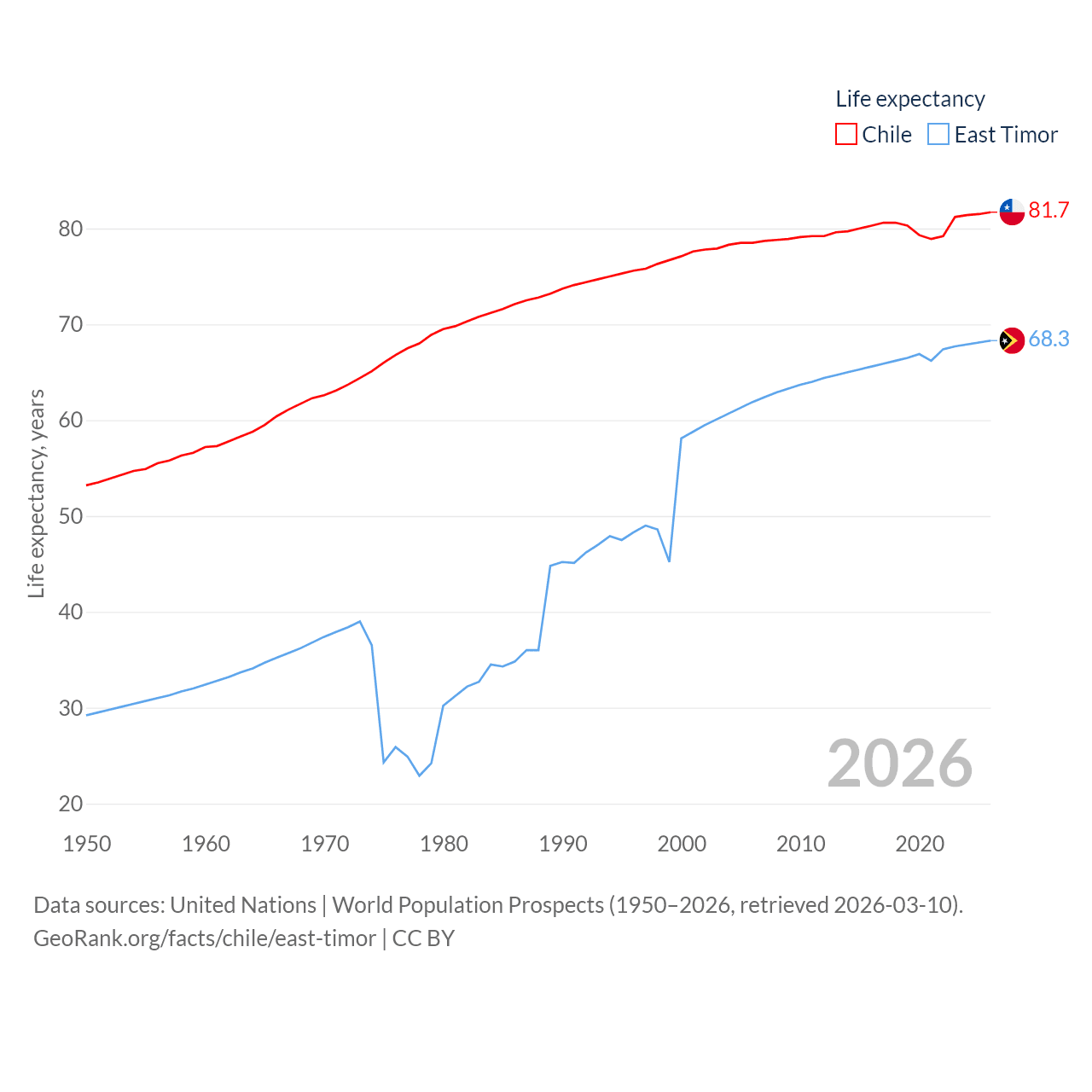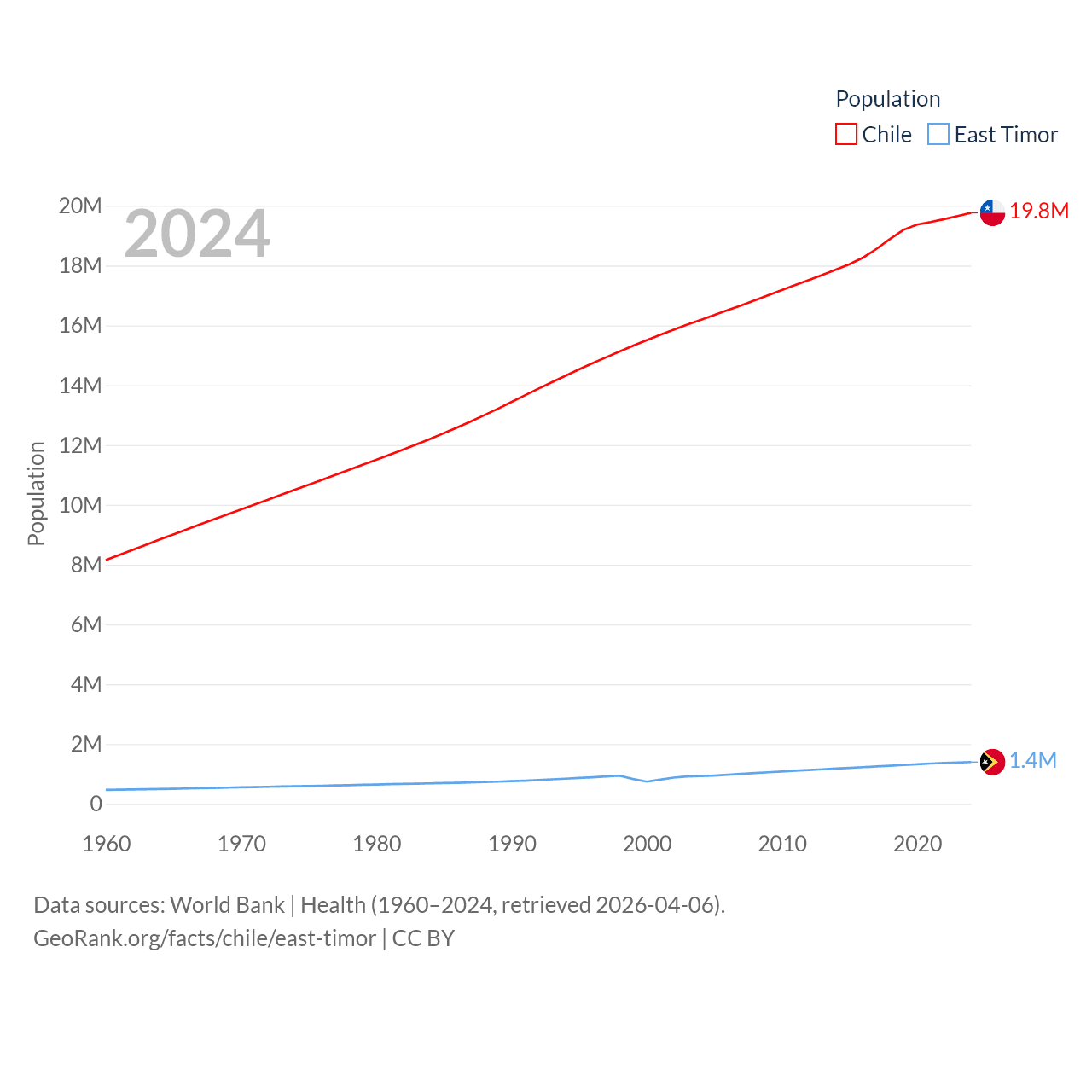 Chile has a population of 19.8M (ranked 66/197), compared with 1.4M in East Timor (ranked 152/197). Chile's land area is 286,809 sq mi versus 5,741 sq mi for East Timor (ranked 38th vs. 155th).